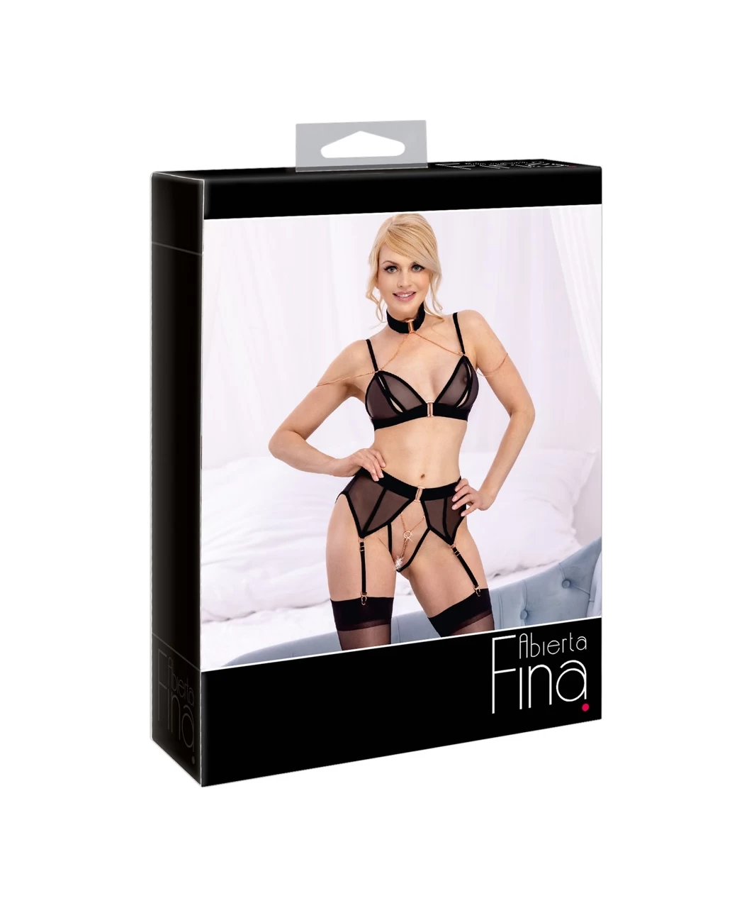 Black soft bra and crotchless suspender panties in a set made of stretchy sheer mesh with stylish velvet details and rose gold coloured metal chains and buckles. The bra has slitted cups and adjustable hook and eye closure at the back. The set is completed with velvet choker. The shoulder straps and suspenders are adjustable. All the chains are detachable.