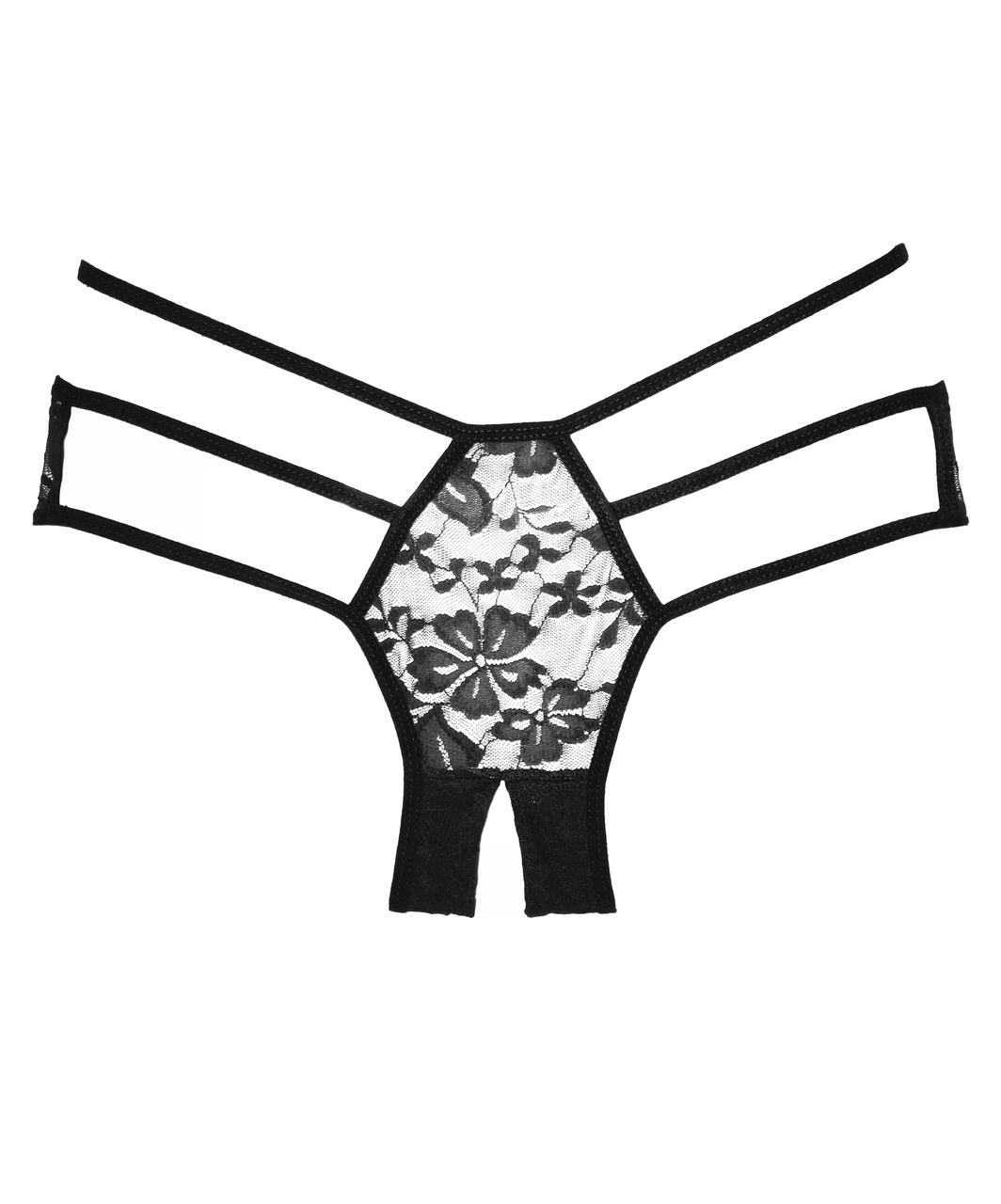 Black mesh and lace crotchless thong.