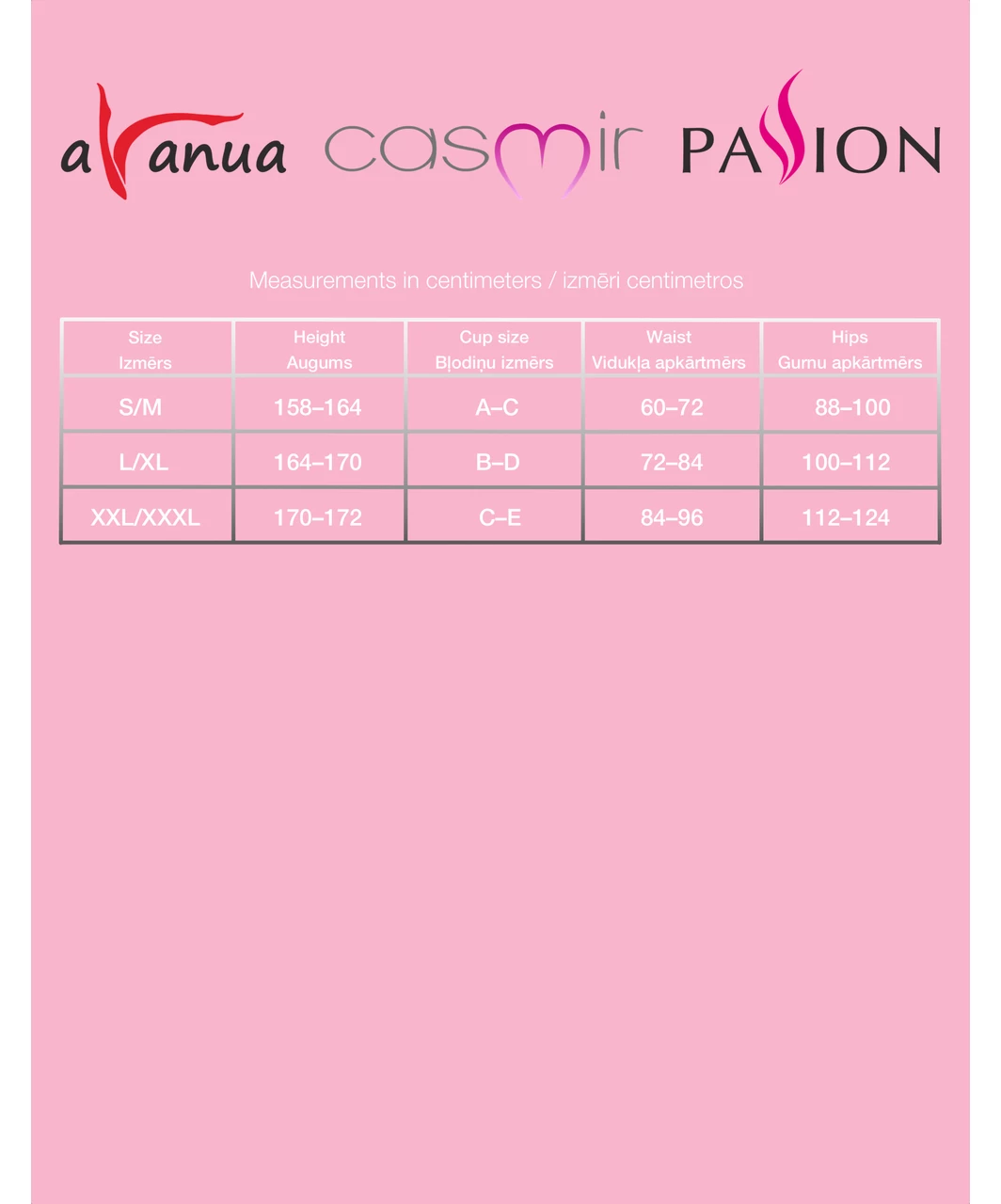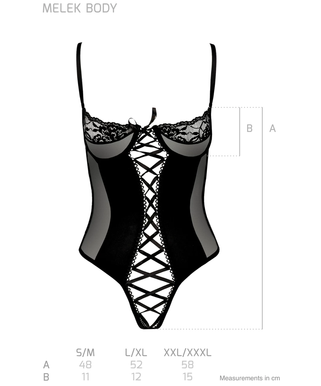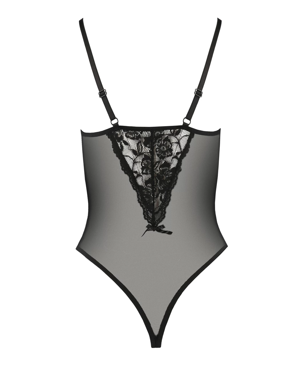 Black sheer mesh bodysuit with satin inserts and a lacing in the front. With supporting underwire; the length of the straps are easily adjusted.