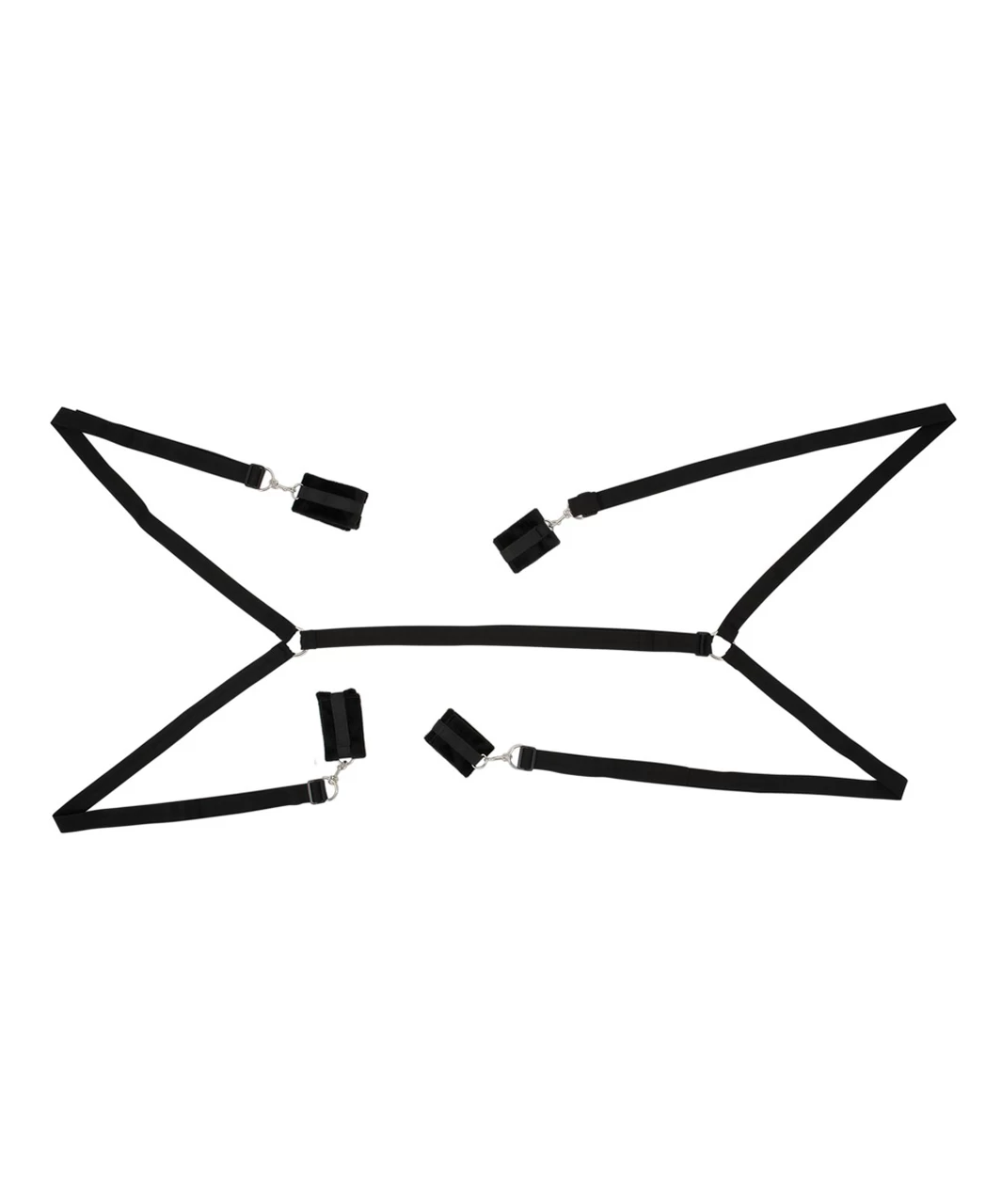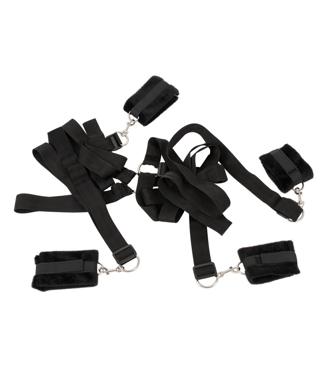 The four straps with snap hooks on the ends are placed under the mattress and the connection strap joins them all together. Put the handcuffs and ankle cuffs on your partner, and then attach them to the snap hooks. The cuffs can be adjusted because they have hook and loop fasteners.