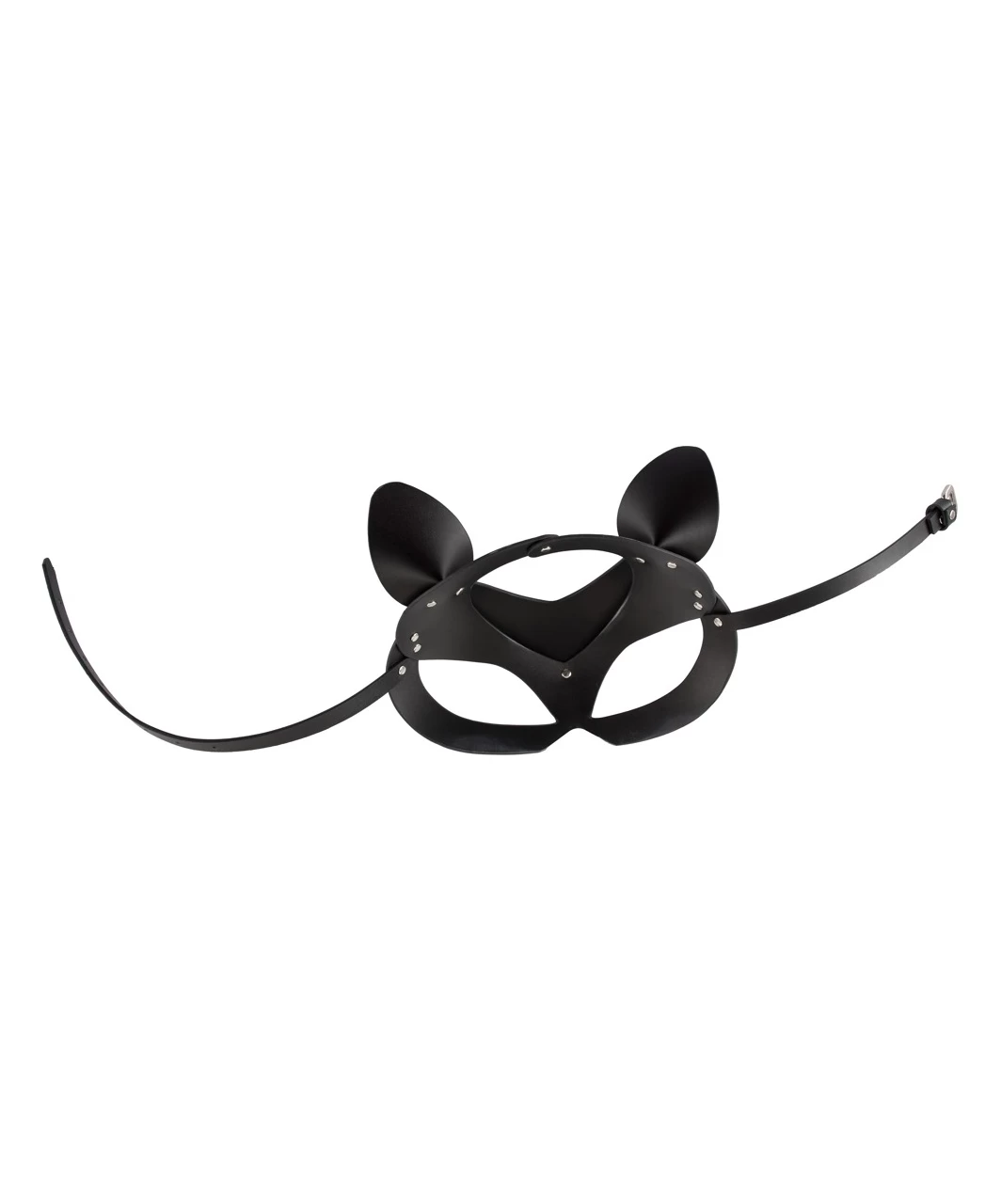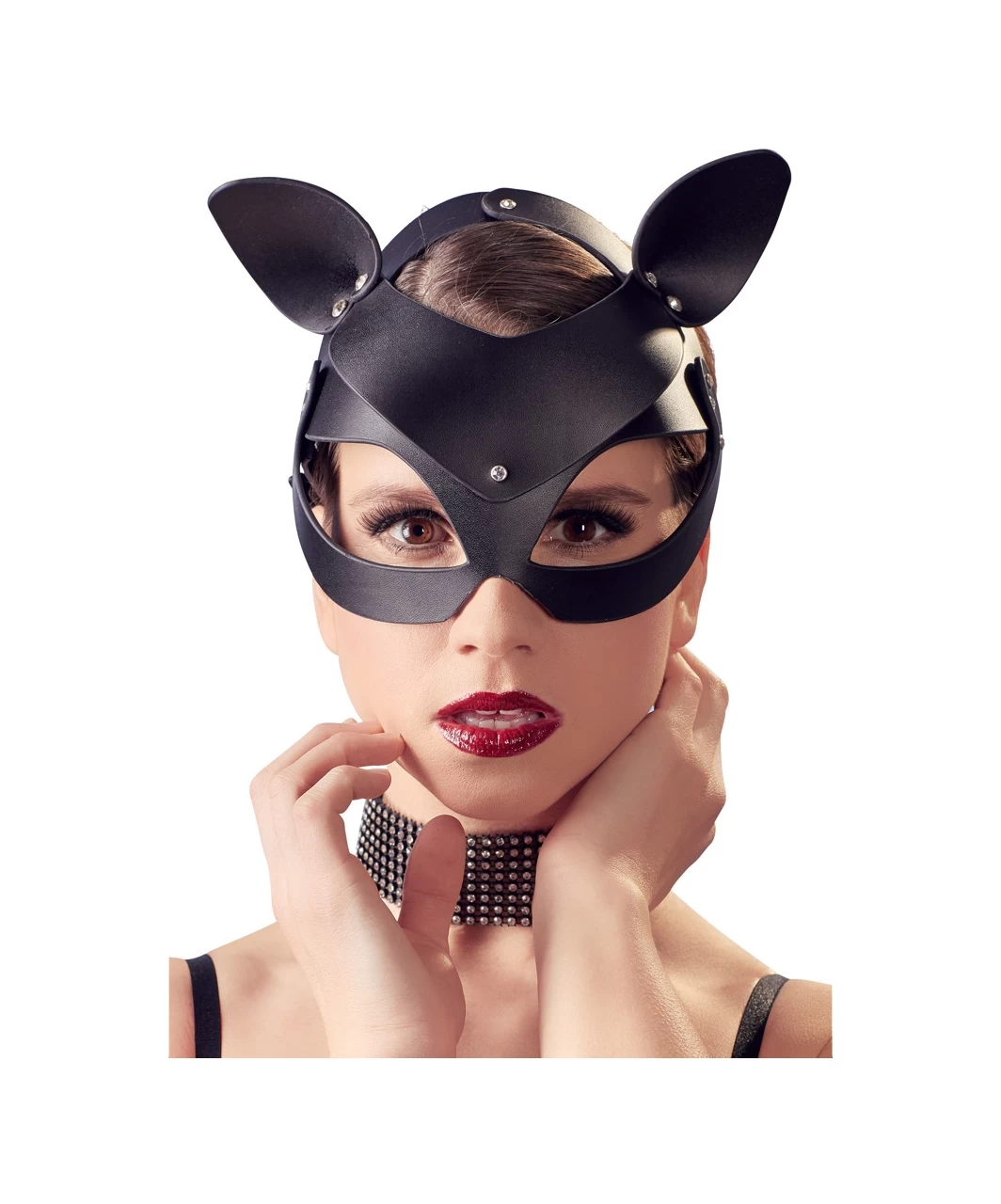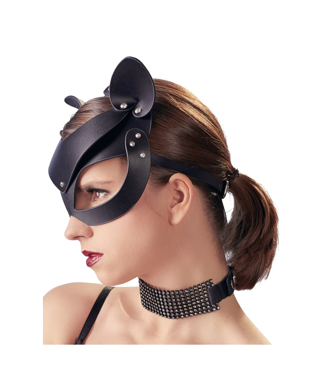 Sturdy leather-look head mask with cat ears and miniature rhinestone rivets – a purrfect accessory for an exciting role play. With press studs and buckle fastener at the back for an ideal fit. Unisize. Without collar.