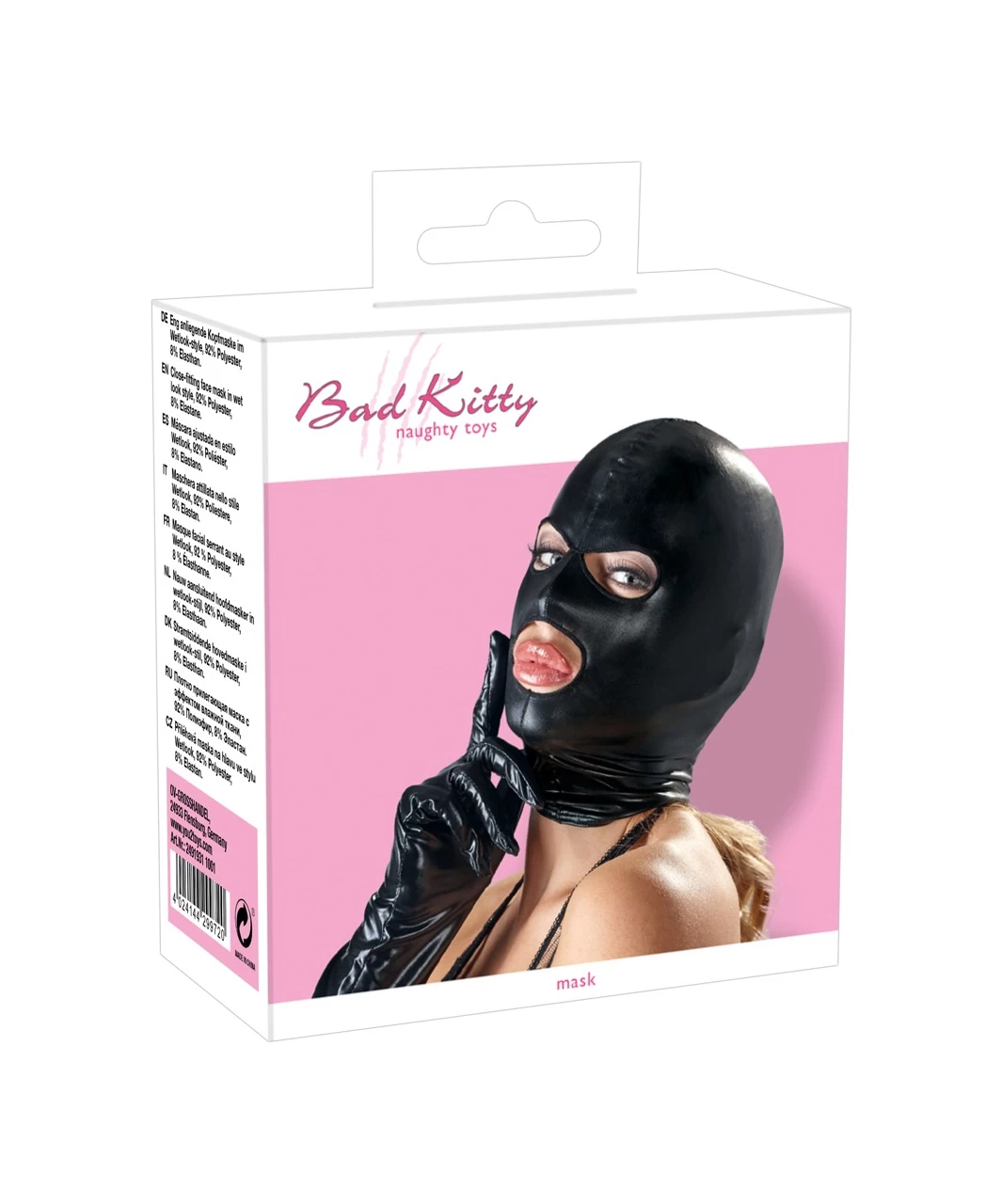 Black tight-fitting head mask made of shiny wet look fabric. With holes for the mouth and eyes. Elastic hem around the neck part. One size fits most.
