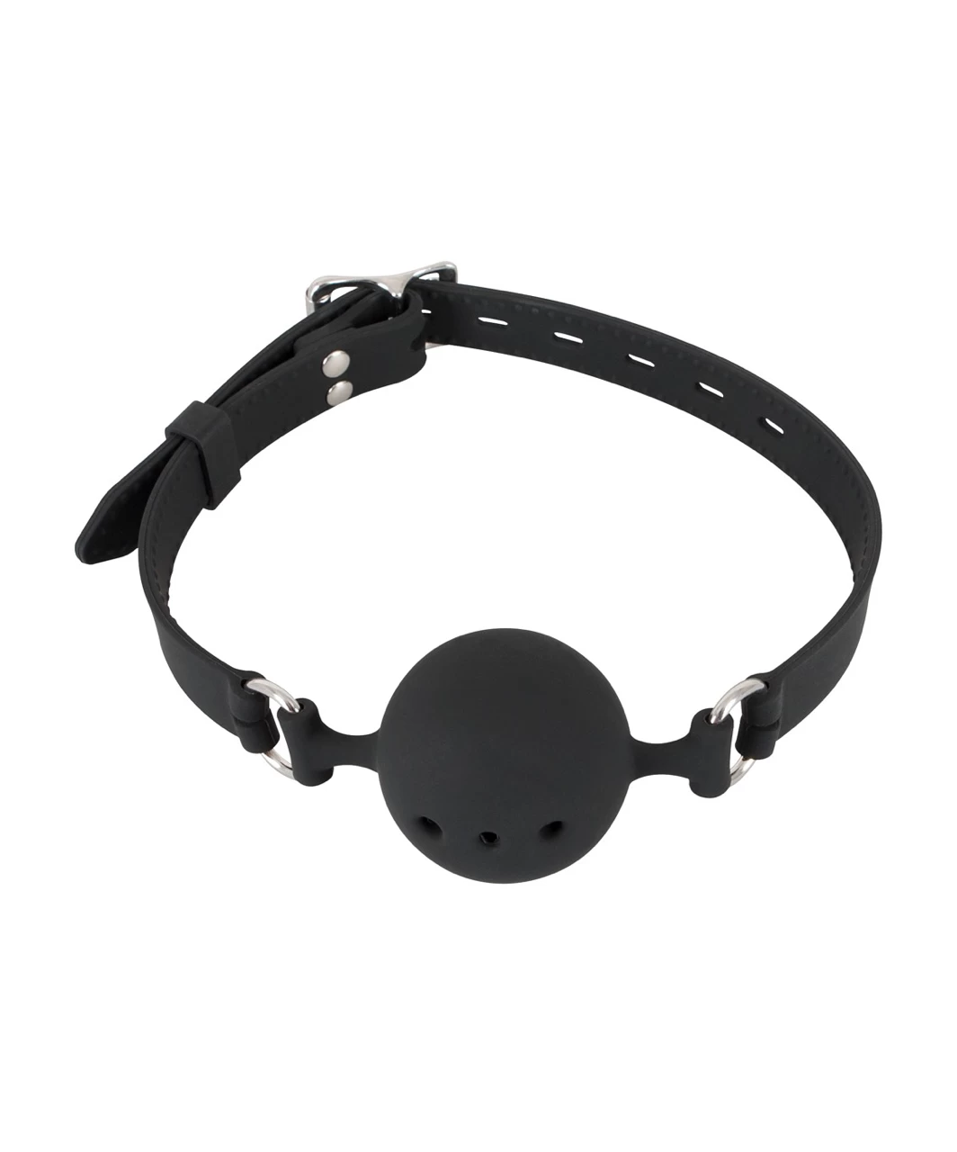 Black gag with breathing holes and adjustable strap. Material: silicone.