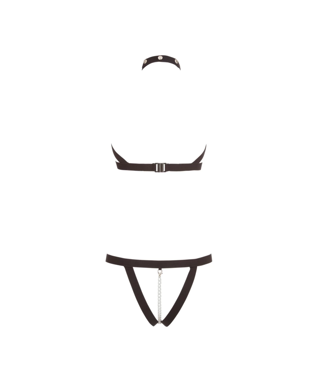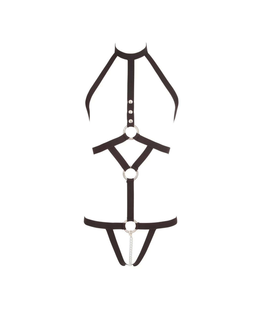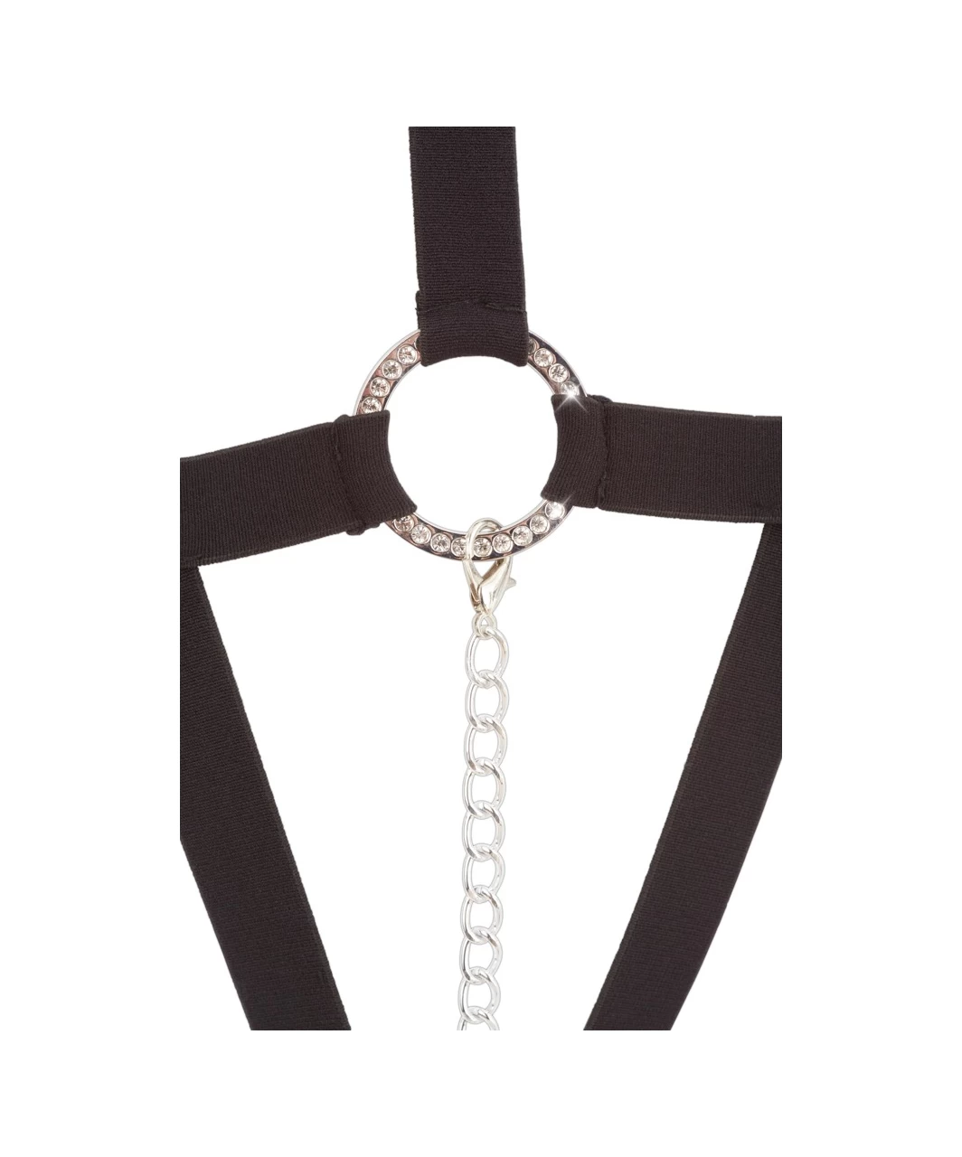 This black strap body is made of soft fabric-covered elastic straps decorated with rhinestone rings at the front and decorative metal press studs on the strap between the breasts. There is a removable silver-coloured metal chain that goes over the crotch. With a fastener at the back. Unisize.