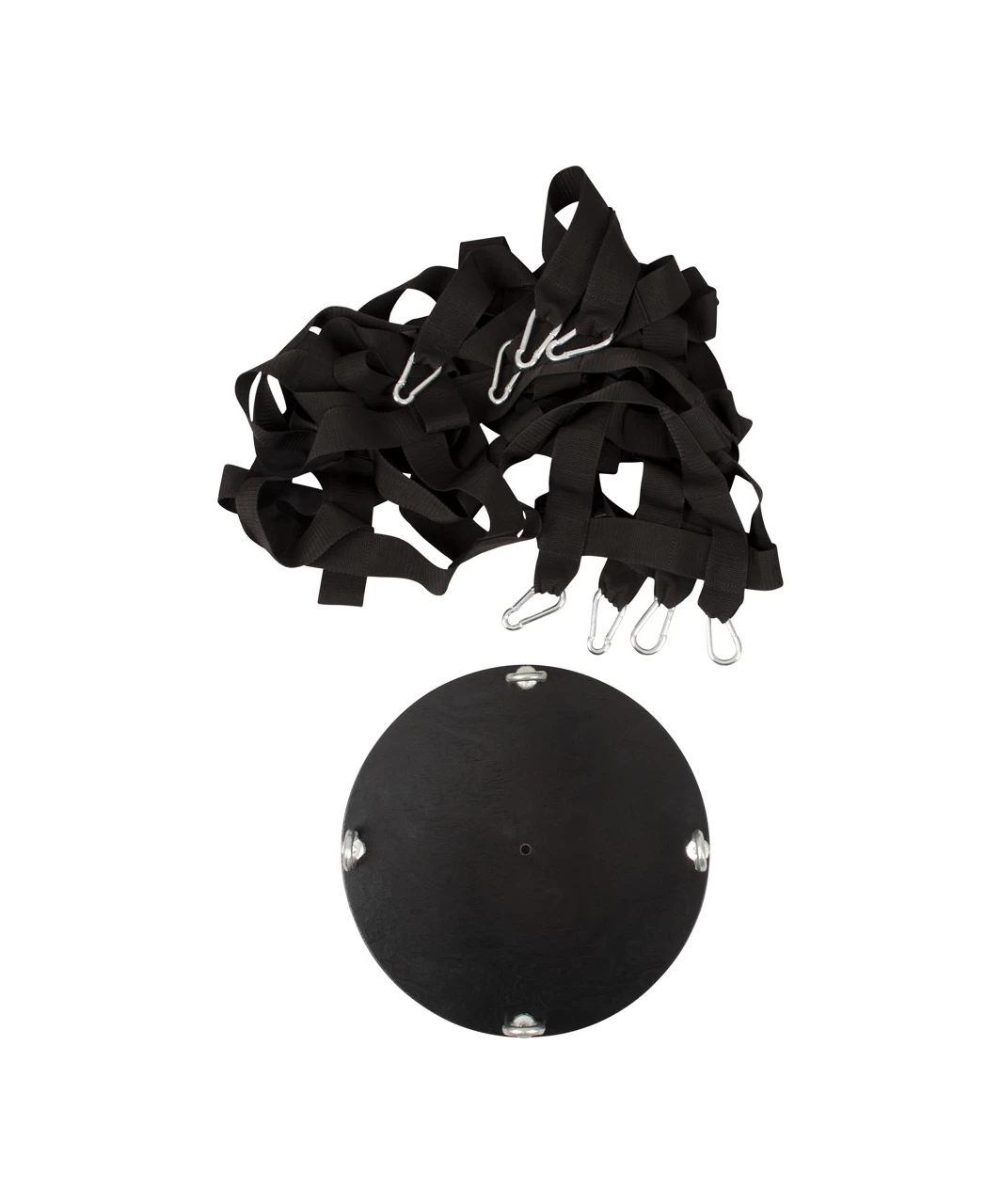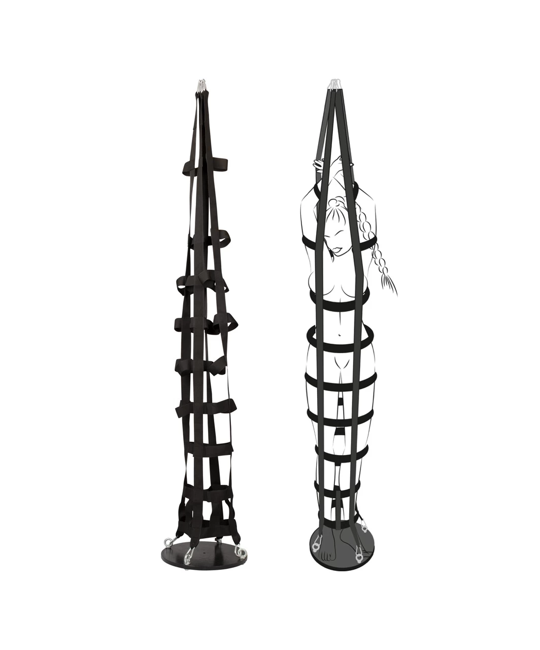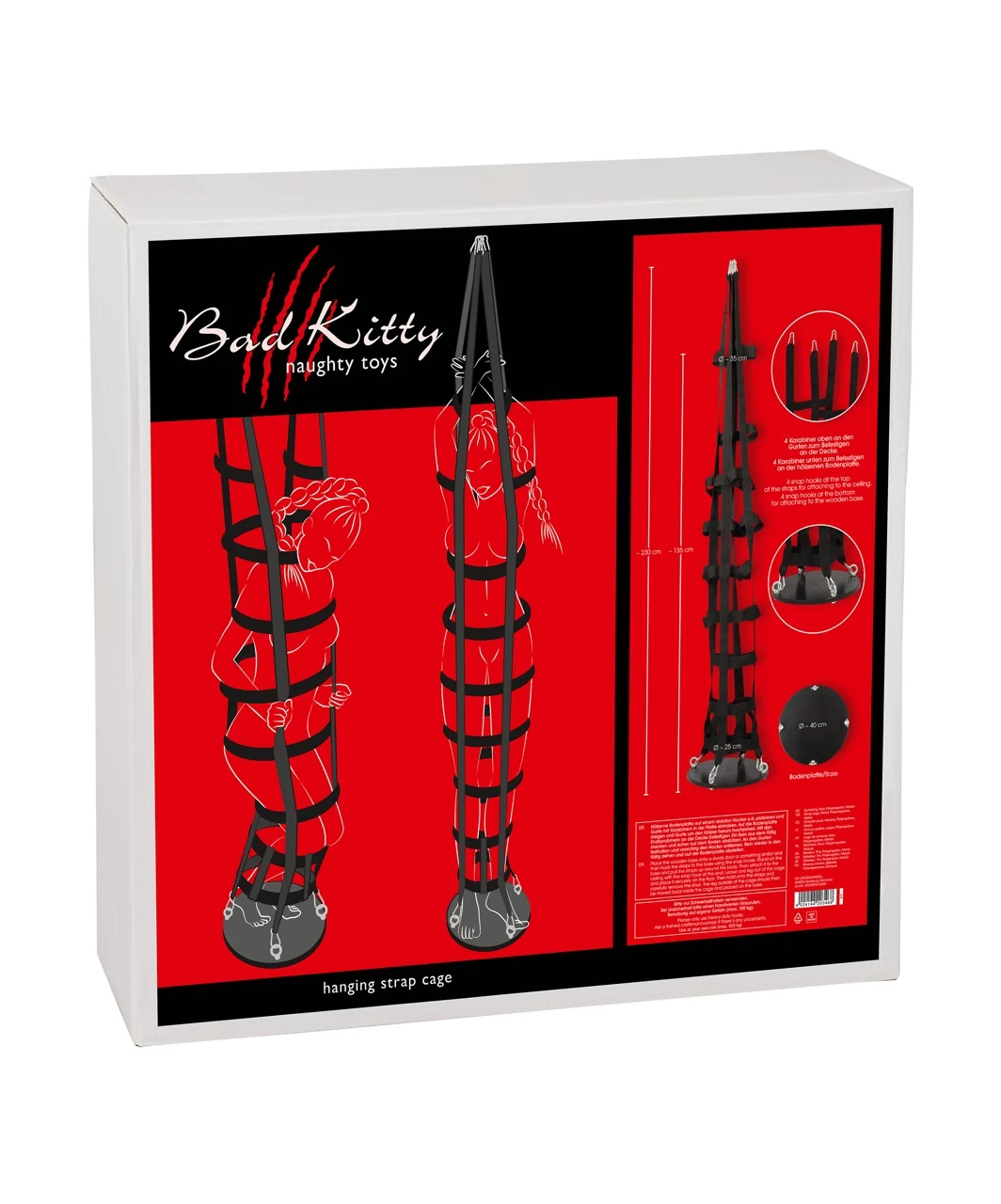 The hanging strap cage holds the sub very tight. The strap construction can be easily attached to the sturdy, round base with the snap hooks. The textile straps are tear-proof. The straps have sturdy snap hooks at the top as well and they can be used to attach the cage to a ceiling hook (not included).