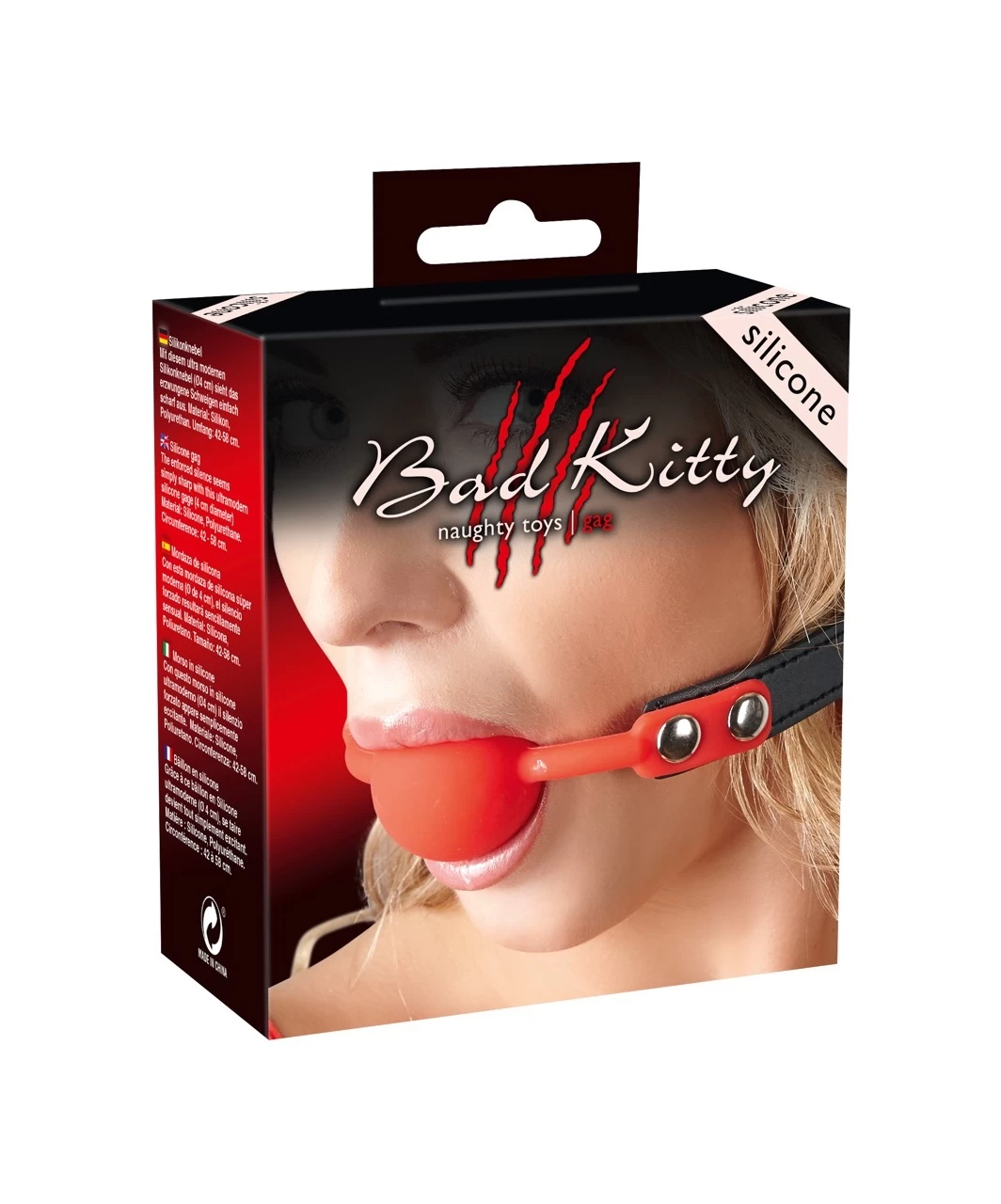 Red silicone ball gag with black straps. It has an adjustable 9-hole strap closure with a metal buckle.