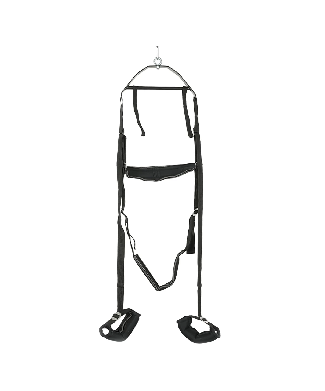 Love swing to realize technically impossible bed postures and to give love-making an off-the-ground feeling. 33 cm wide cross-bar construction. All straps are fully adjustable and made of tear proof, padded nylon. Black. Max. load: 100 kg. Includes an 8-tailed whip (38 cm) with leather handle, one eye mask and an assembly kit. Material: metal, polyester, split leather, polyamide.