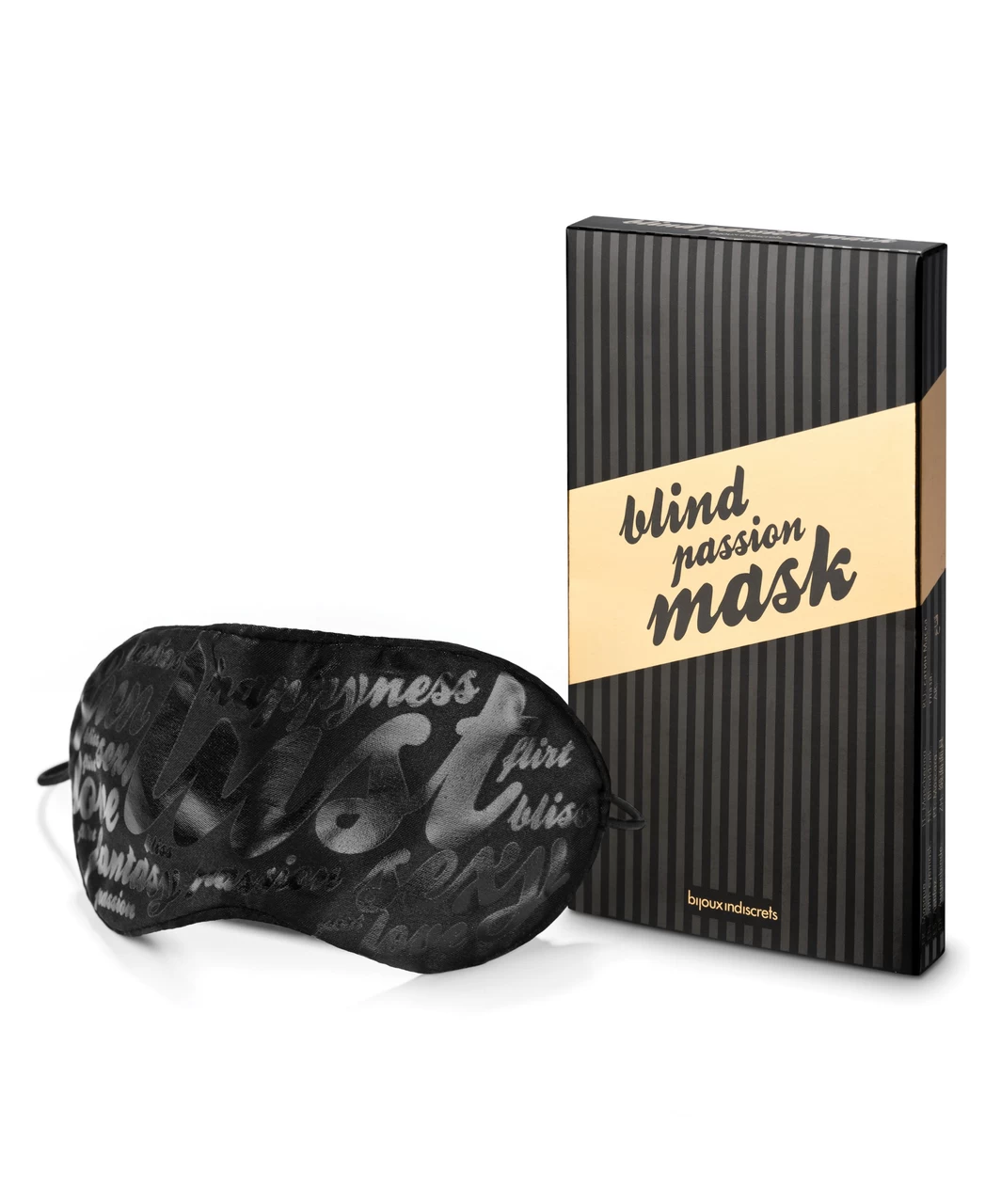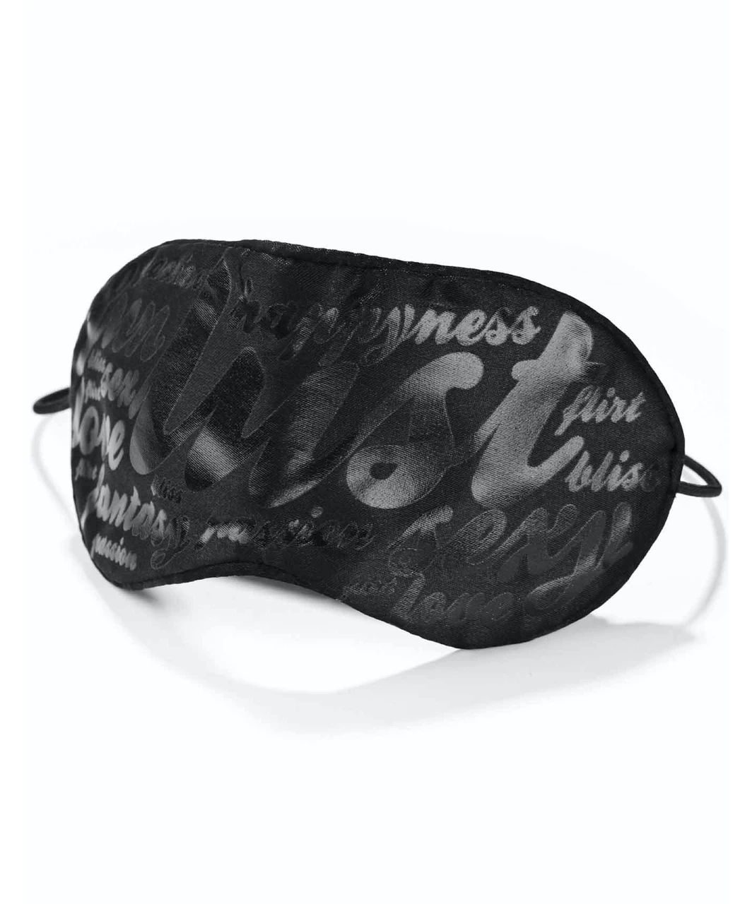 Black soft blindfold with a word pattern and elastic band. Enjoy the sensations and let yourself be drawn into the surprise!