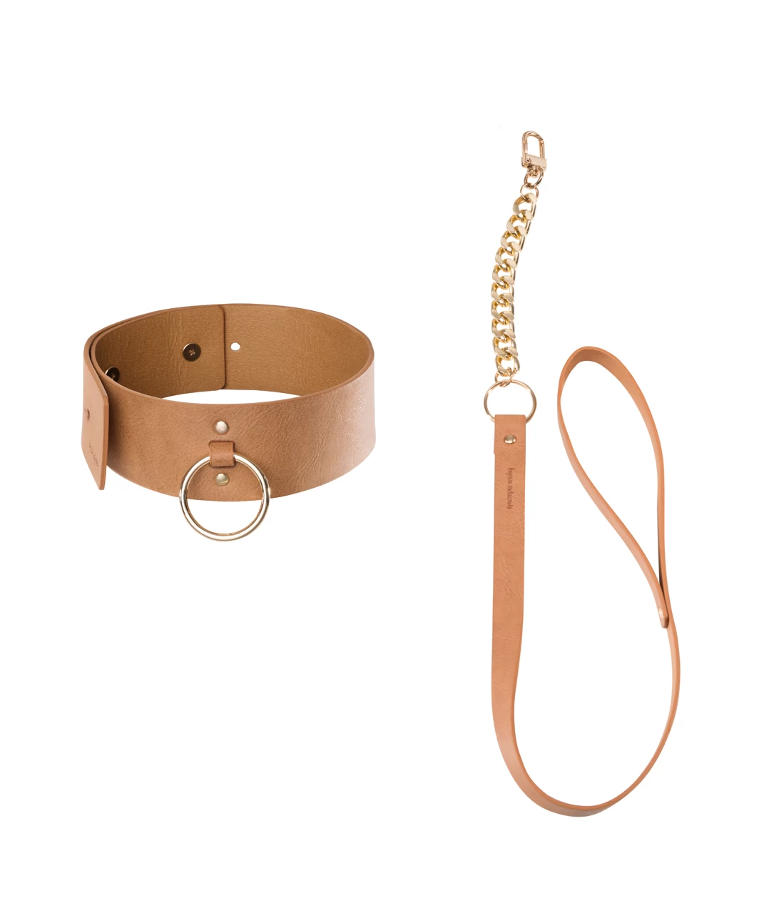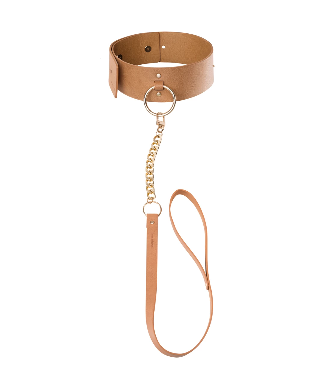 Let your senses get lost in the labyrinth and find the place where Your visible side merges with the hidden one. MAZE is a collection of accessories for women inspired by the BDSM culture. This elegant lightweight collar with gold inserts will be a great addition to your mysterious, bold and captivating look or seductive element in an erotic game with elements of BDSM. The collar has a classic adjustable clasp with 6 holes (maximum neck circumference 39 cm), as well as a removable leash with a gold chain.