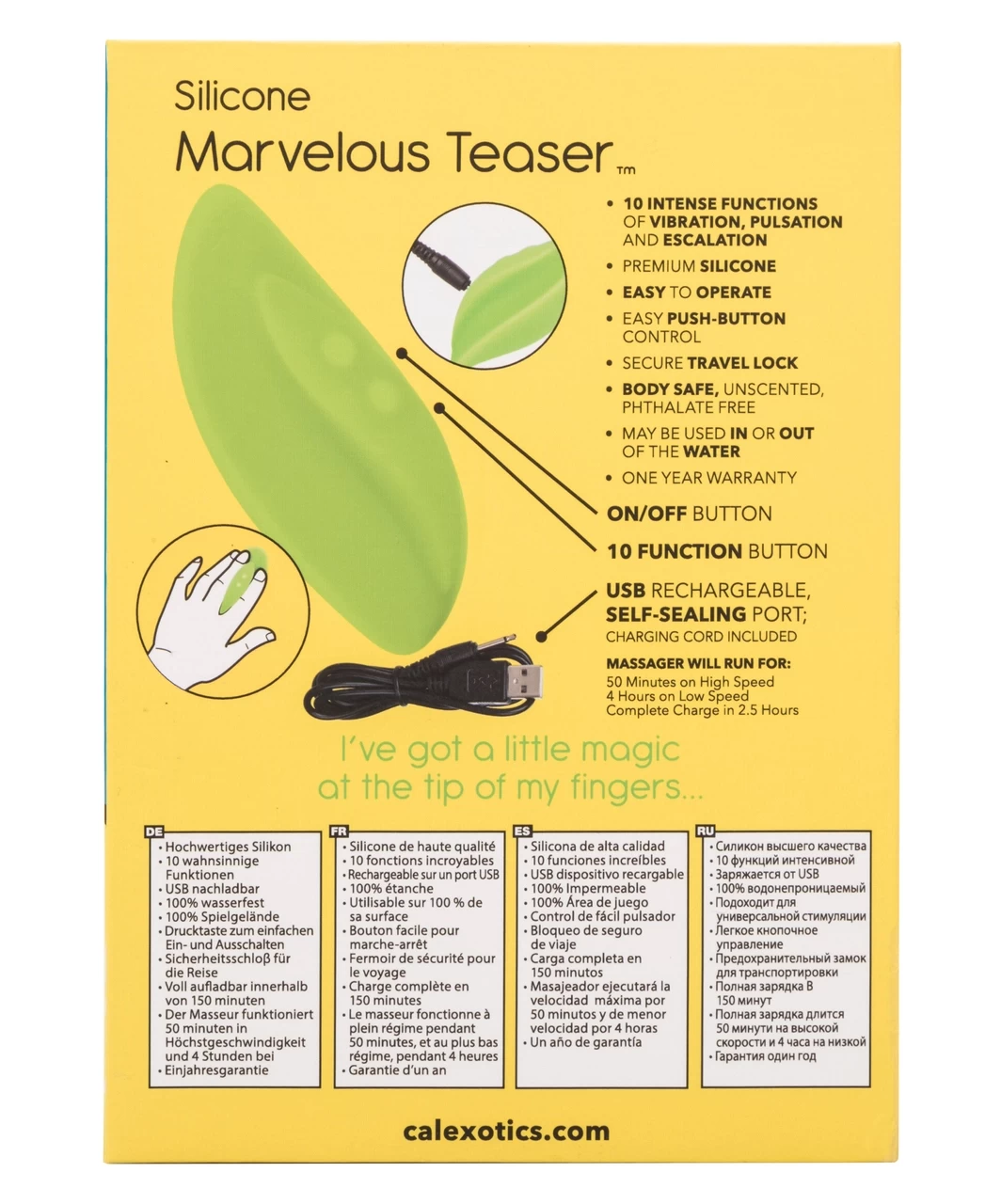 The Silicone Mini Marvels line of vibrators offers this wavy, leaf-shaped mini vibrator in bright green for pleasurable carasses. With it’s velvety soft silicone it easily fits between the fingers. The Marvelous Teaser will provide pleasure with 10 vibrations: 3 intensities and 7 rhythms. The toy is waterproof, therefore it can be used both in bed and in shower or bath. It also has a travel lock which allows to safely transport it in your lugagge. This toy makes a perfect present with it’s beautiful packaging!