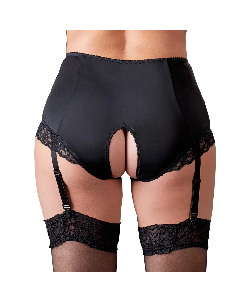 These black briefs are extremely hot because they are open in the crotch area. The four adjustable and removable suspender straps and the elegant lace inserts around the legs add the finishing touch to this sexy lingerie! The sturdy material at the front shapes your stomach slightly. 95% polyester, 5% elastane.