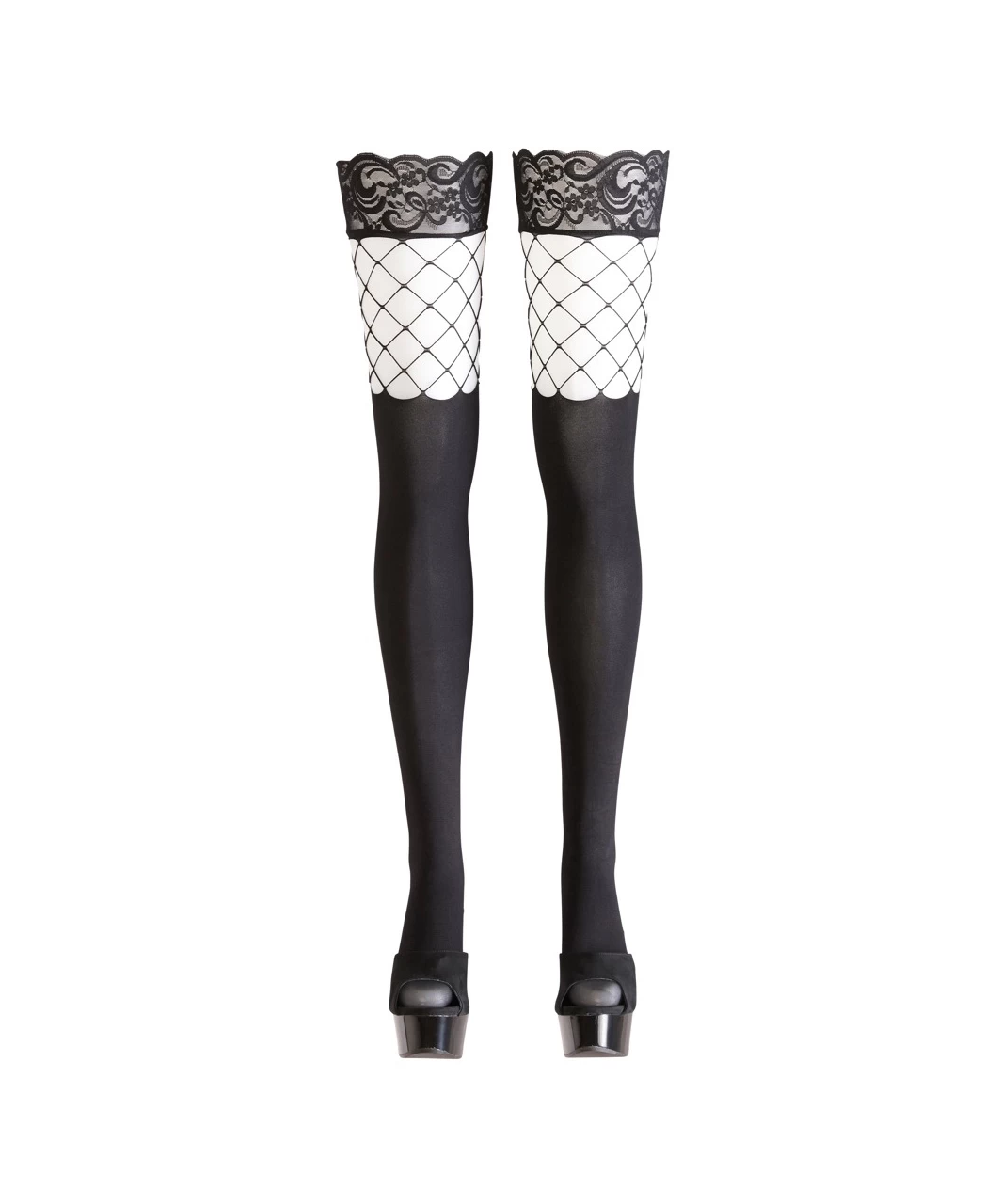 The 2-in-1 look for your legs: black stay-ups made of opaque and net material in one! Opaque from foot to knee, above with rough net. Lace top strengthened with silicone.