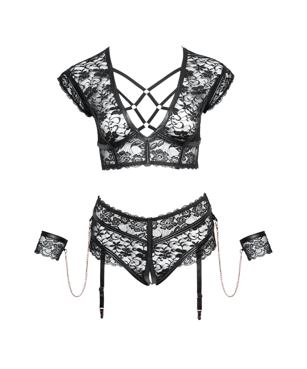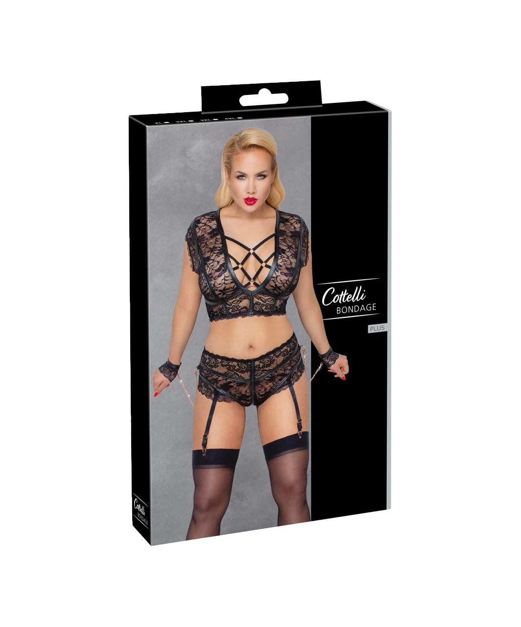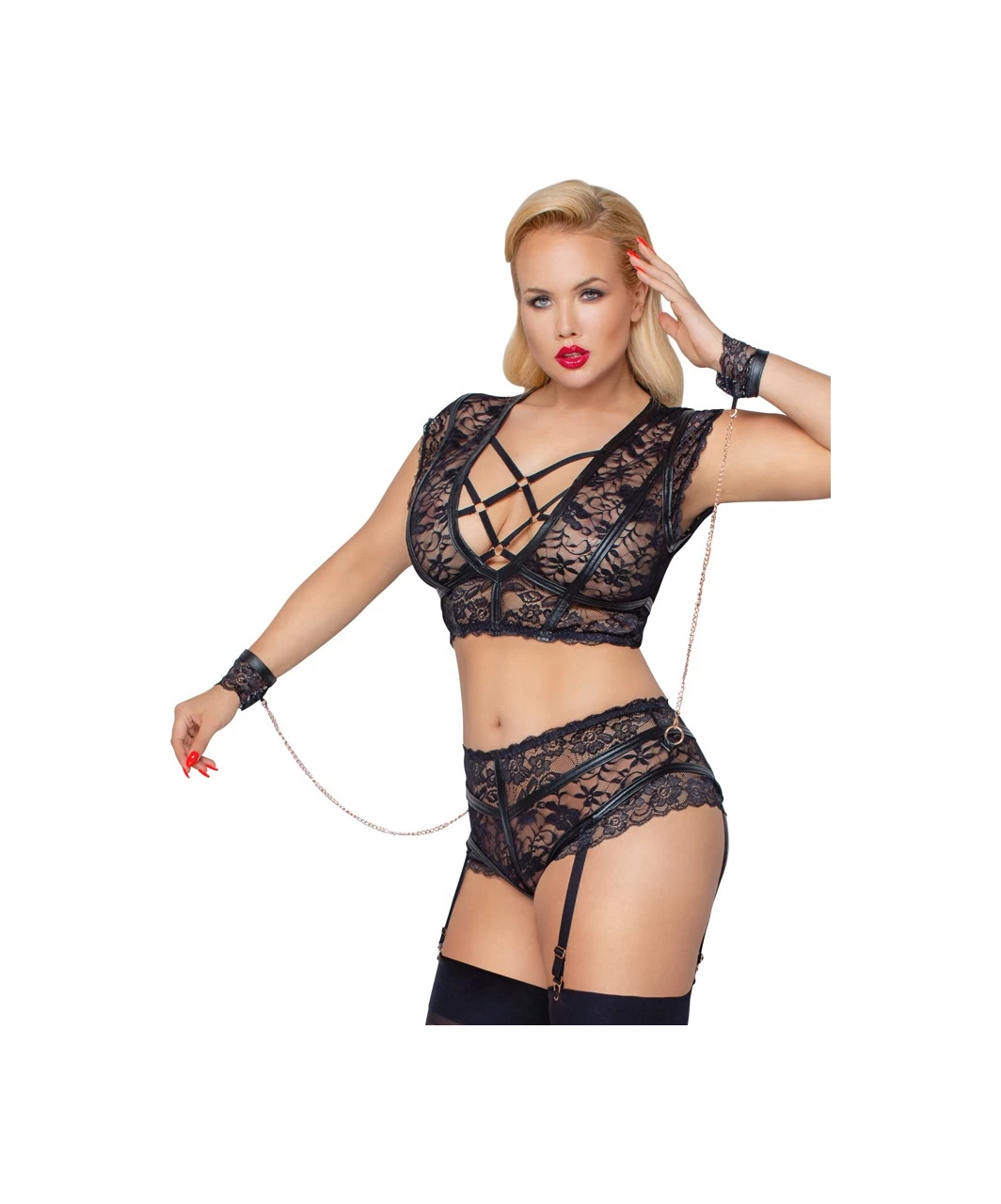Cottelli Lingerie Bondage now in plus size! Black floral lace suspender set with matte look details. Low cut bustier adorned with criss cross elastic straps and rose gold-coloured rings, has an adjustable hook closure on the back. Crotchless high waist panties has four detachable and adjustable garters. Completed with soft wrist cufs with rose gold-coloured chains.