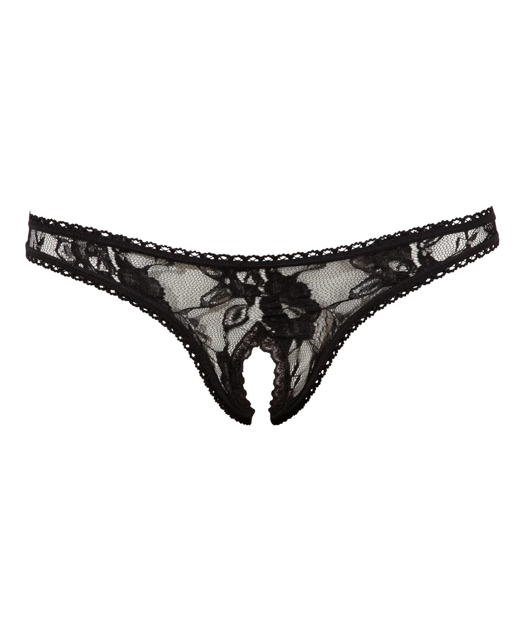 Black crotchless thong made of lace.