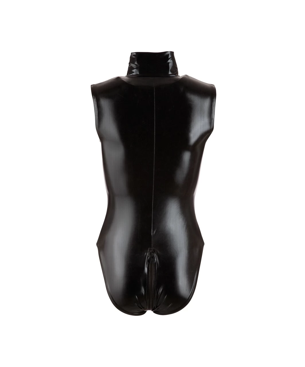 Black matte look sleeveless bodysuit with high collar and long two-way zipper that goes from the collar over the crotch to the top of the bum.