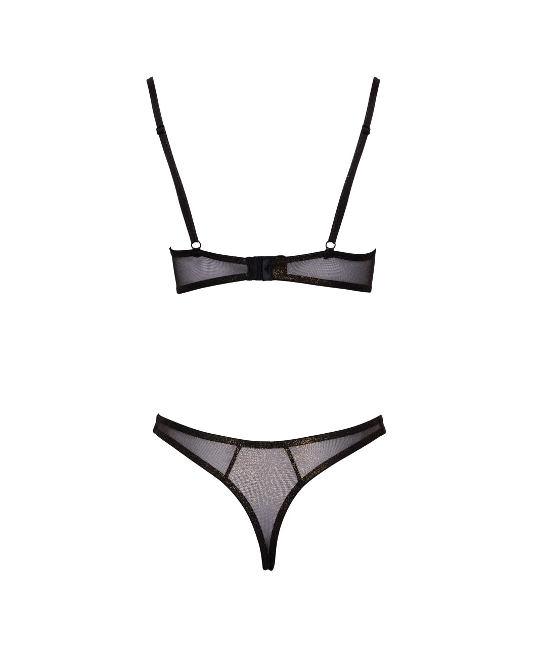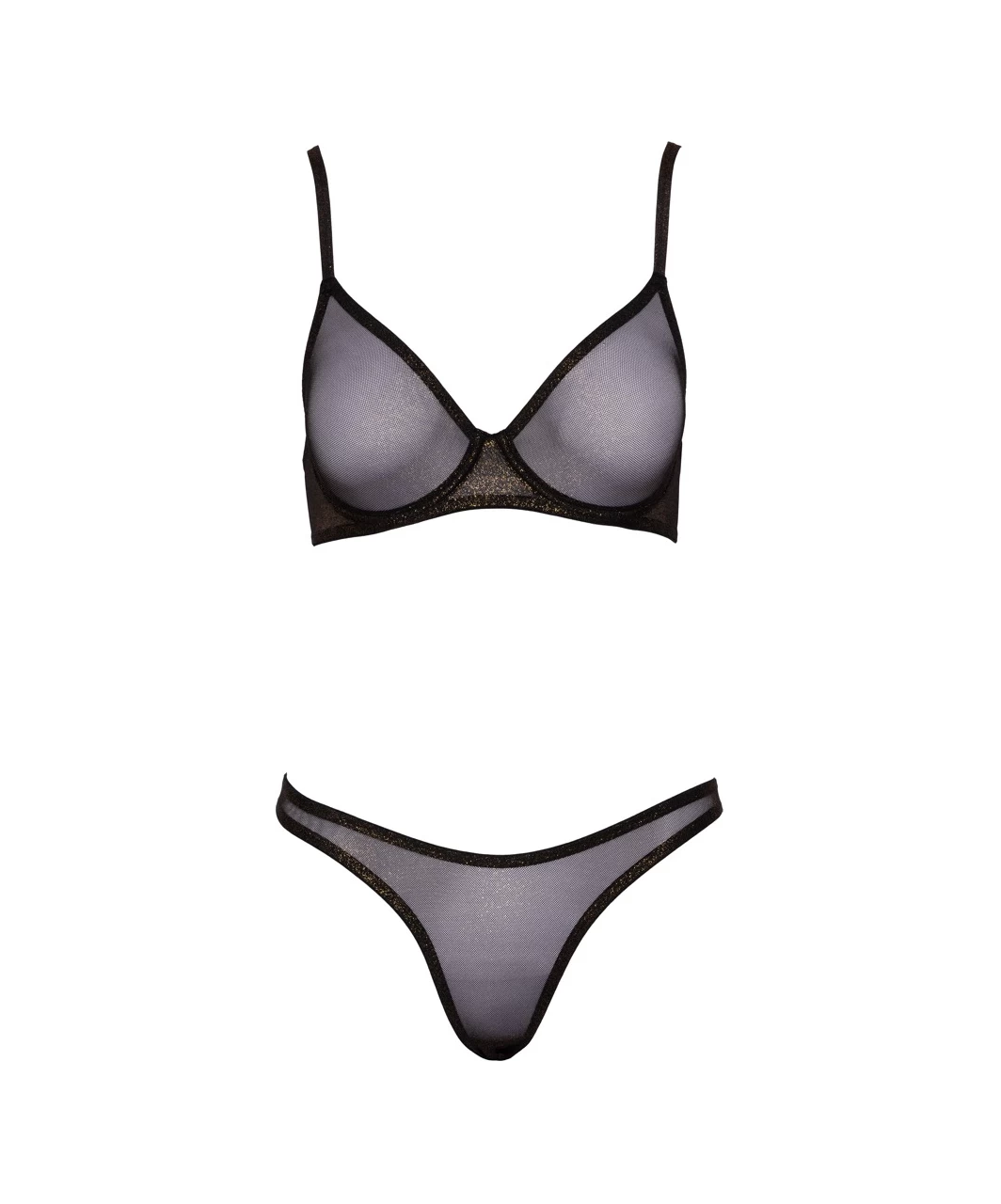 Black shimmering sheer mesh lingerie set – underwire bra and matching thong. The bra has adjustable hook and eye back closure. Straps also adjustable.