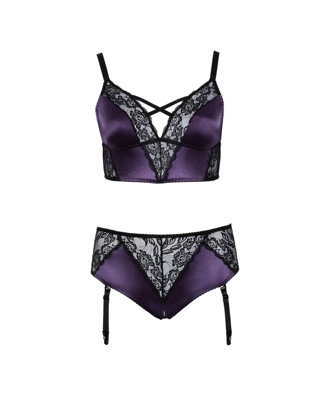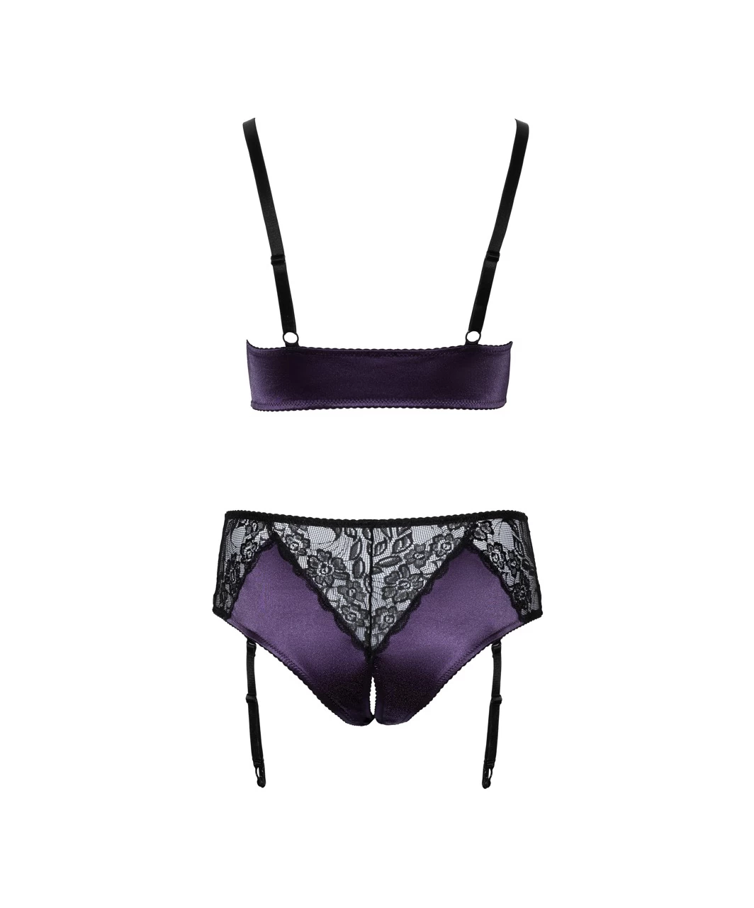 The soft bralette and crotchless suspender briefs in a set made of a beautiful purple satin and delicate black floral lace. The wide stretchy shoulder straps are adjustable. The suspenders are adjustable and detachable.