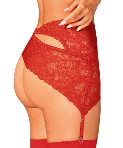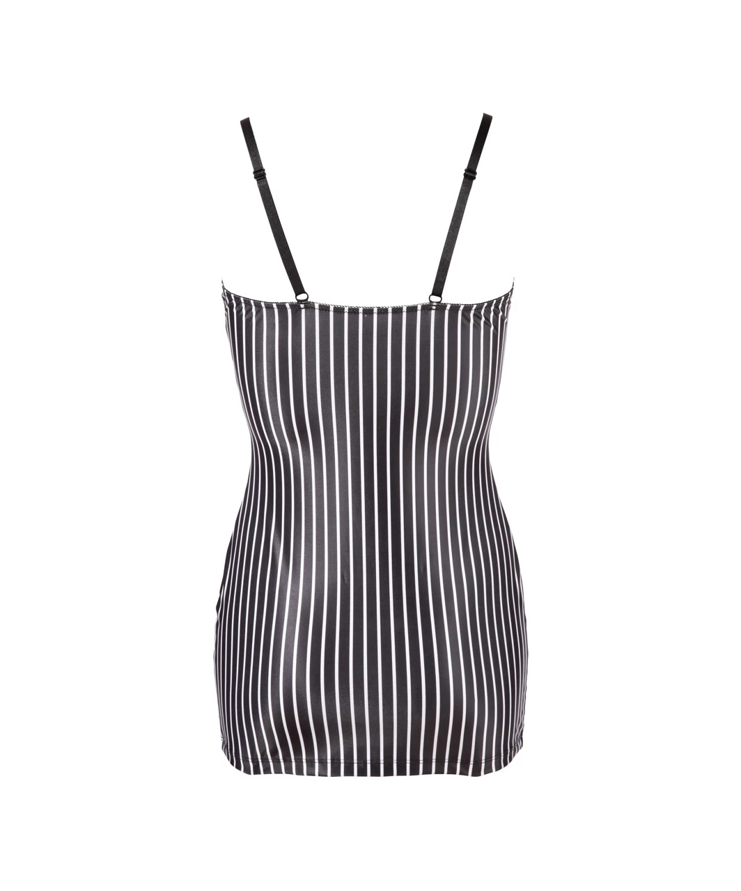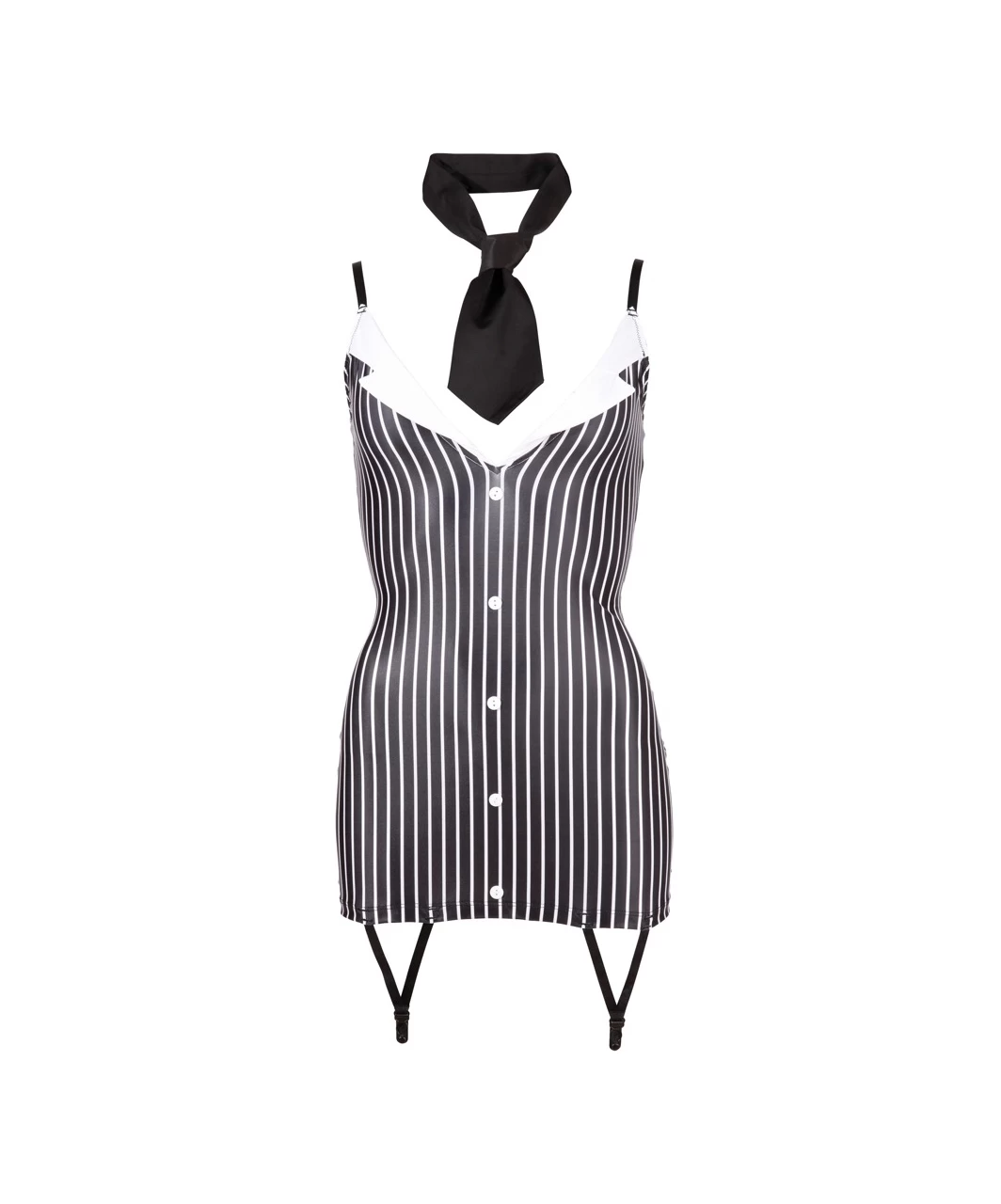 Tight fitting striped mini dress with adjustable straps and two suspender straps in the front. Patched studs in the front and fake collar at the deep cleavage. Tie included. Without stockings.