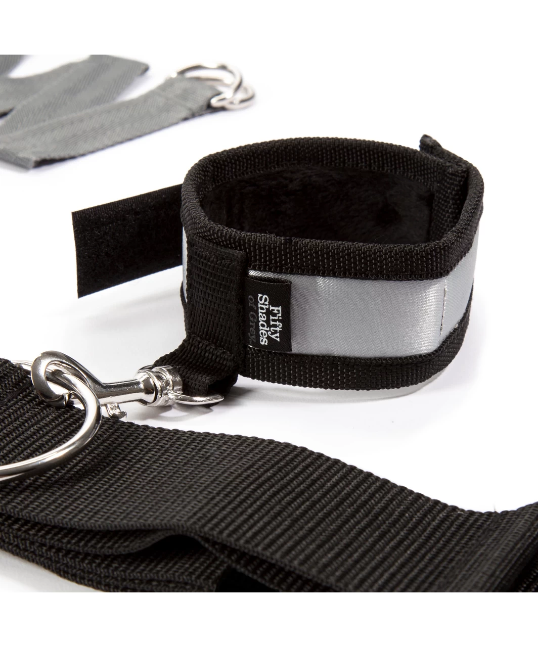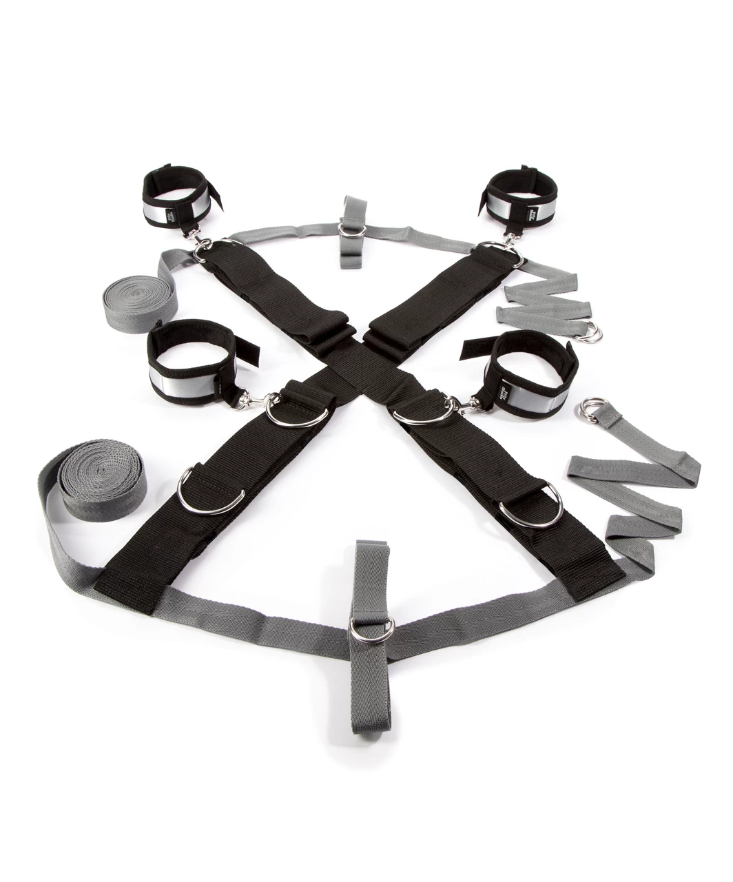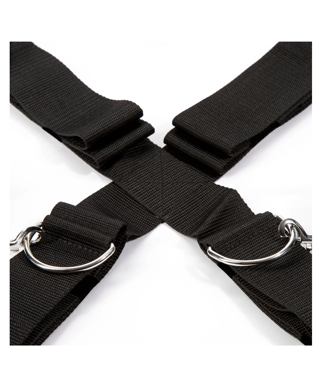 Explore new styles of bondage play with this over the bed cross restraint, which allows ankle and wrist cuffs to be positioned both vertically and horizontally. A deluxe new spin on a classic restraint system, inspired by the Fifty Shades of Grey books. Unguarded vulnerability or spread-eagled exposure? The choice is the dominant’s, as they arrange the cuffs for maximum excitement. Double up the fun once more by securing the submissive on their front – the versatile restraint allows for a wide variety of positions. The quality wrist and ankle cuffs feature a soft satin exterior, with the inside lined with faux fur for a truly comfortable experience. Fastened by secure, adjustable Velcro, the cuffs are simple for a partner to secure and remove, yet provide a highly effective restraint tool for the wearer. The restraint is easy to set up and requires no tools for assembly, just a double bed of any size. Place the black straps in a diagonal cross on top of your mattress with the wrist and ankle cuffs at each corner. Feed the thin grey straps around the head and foot of your mattress, taking care to ensure the 2 D-rings remain on top. Feed the straps through the D-rings and tighten.