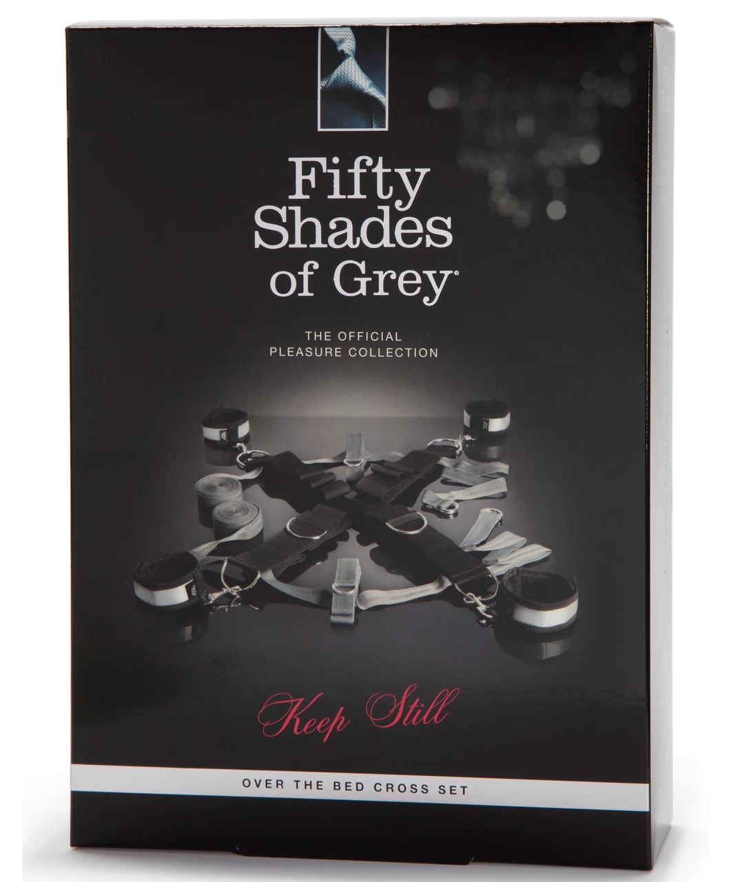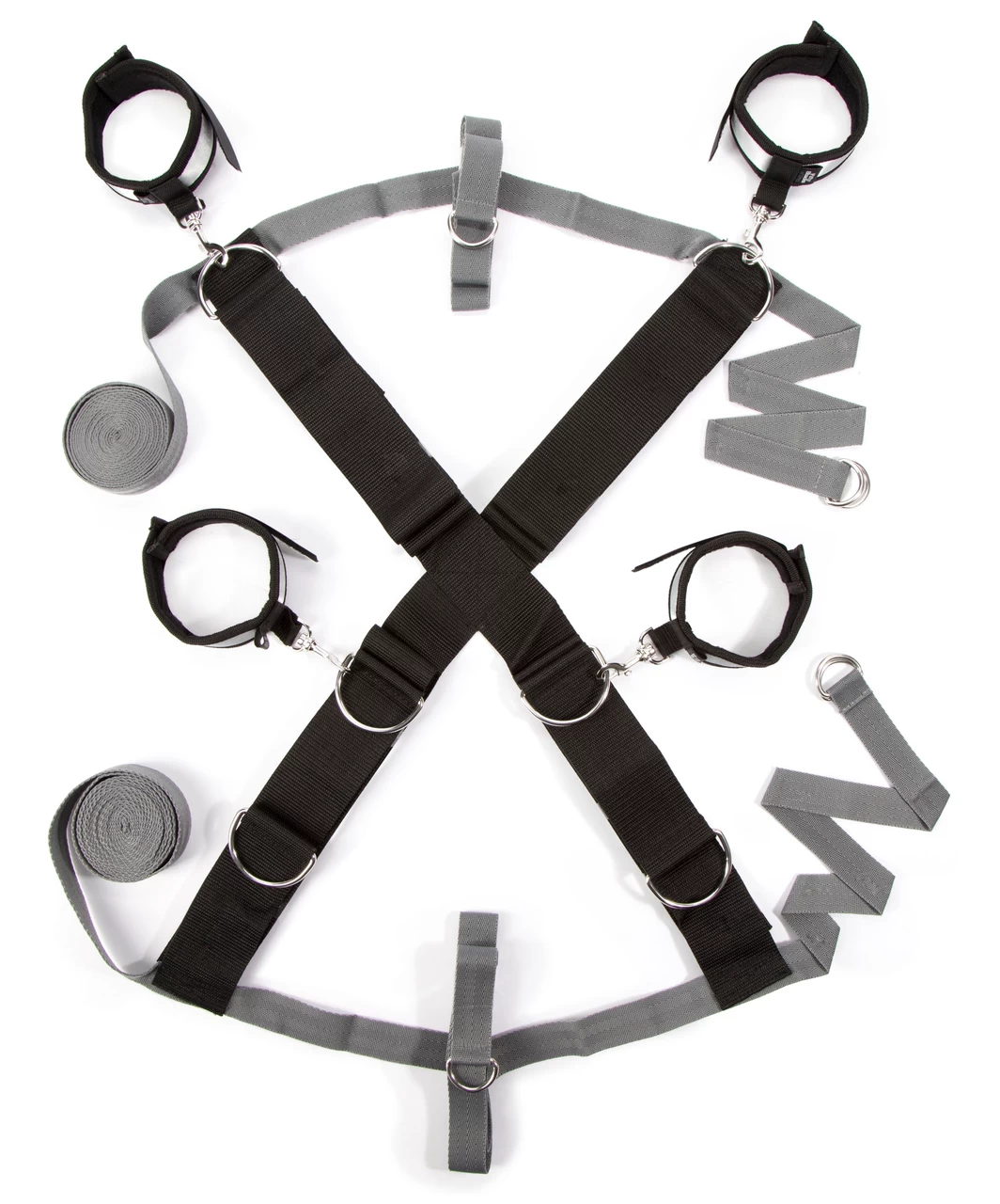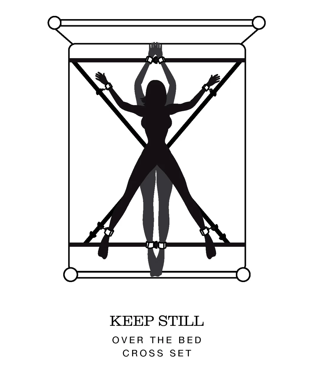 Explore new styles of bondage play with this over the bed cross restraint, which allows ankle and wrist cuffs to be positioned both vertically and horizontally. A deluxe new spin on a classic restraint system, inspired by the Fifty Shades of Grey books. Unguarded vulnerability or spread-eagled exposure? The choice is the dominant’s, as they arrange the cuffs for maximum excitement. Double up the fun once more by securing the submissive on their front – the versatile restraint allows for a wide variety of positions. The quality wrist and ankle cuffs feature a soft satin exterior, with the inside lined with faux fur for a truly comfortable experience. Fastened by secure, adjustable Velcro, the cuffs are simple for a partner to secure and remove, yet provide a highly effective restraint tool for the wearer. The restraint is easy to set up and requires no tools for assembly, just a double bed of any size. Place the black straps in a diagonal cross on top of your mattress with the wrist and ankle cuffs at each corner. Feed the thin grey straps around the head and foot of your mattress, taking care to ensure the 2 D-rings remain on top. Feed the straps through the D-rings and tighten.