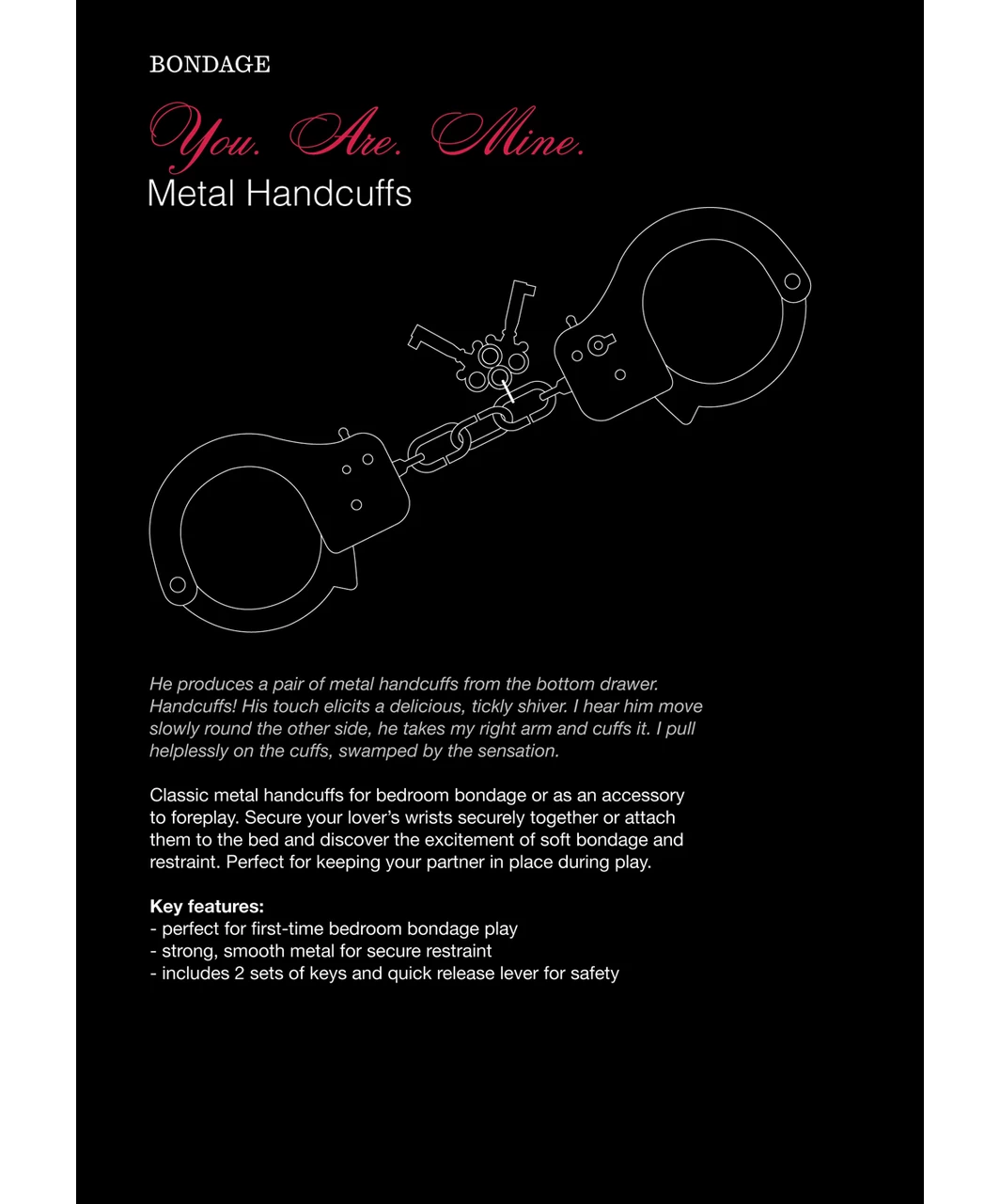 Classic metal handcuffs for bedroom bindage or as an accessory to foreplay. Secure your lover`s wrists securely together or attach them to the bed and discover the excitement of soft bondage and restraint. Perfect for keeping your partner in place during play. Key features: – perfect for first-time bedroom bondage play – strong, smooth metal for secure restraint – includes 2 sets of keys and quick release lever for safet