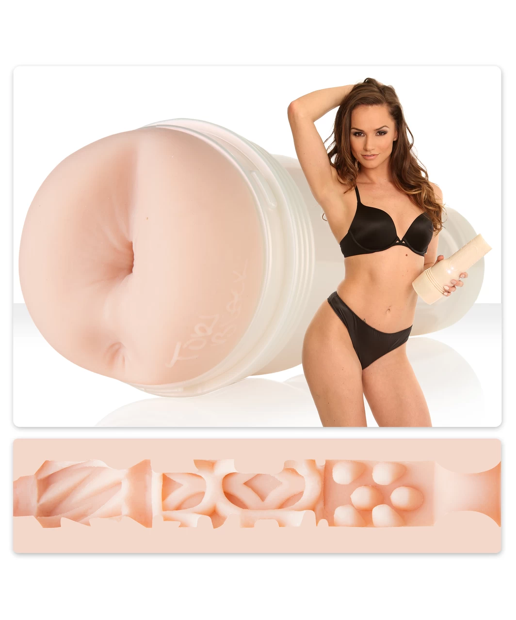 A replica of Tori Black’s vagina with a soft skin-coloured sleeve infused with her signature Torrid (vagina) and Sultry (anus) textures. The pleasure tunnel is in a pearl white case. Tori’s signature is also on the masturbator. The masturbator can be removed for cleaning. Complete length and insertion depth: 25 cm. Ø flexible. TPE (SuperSkin), phthalate-free according to EU Regulation REACH. Includes instructions.