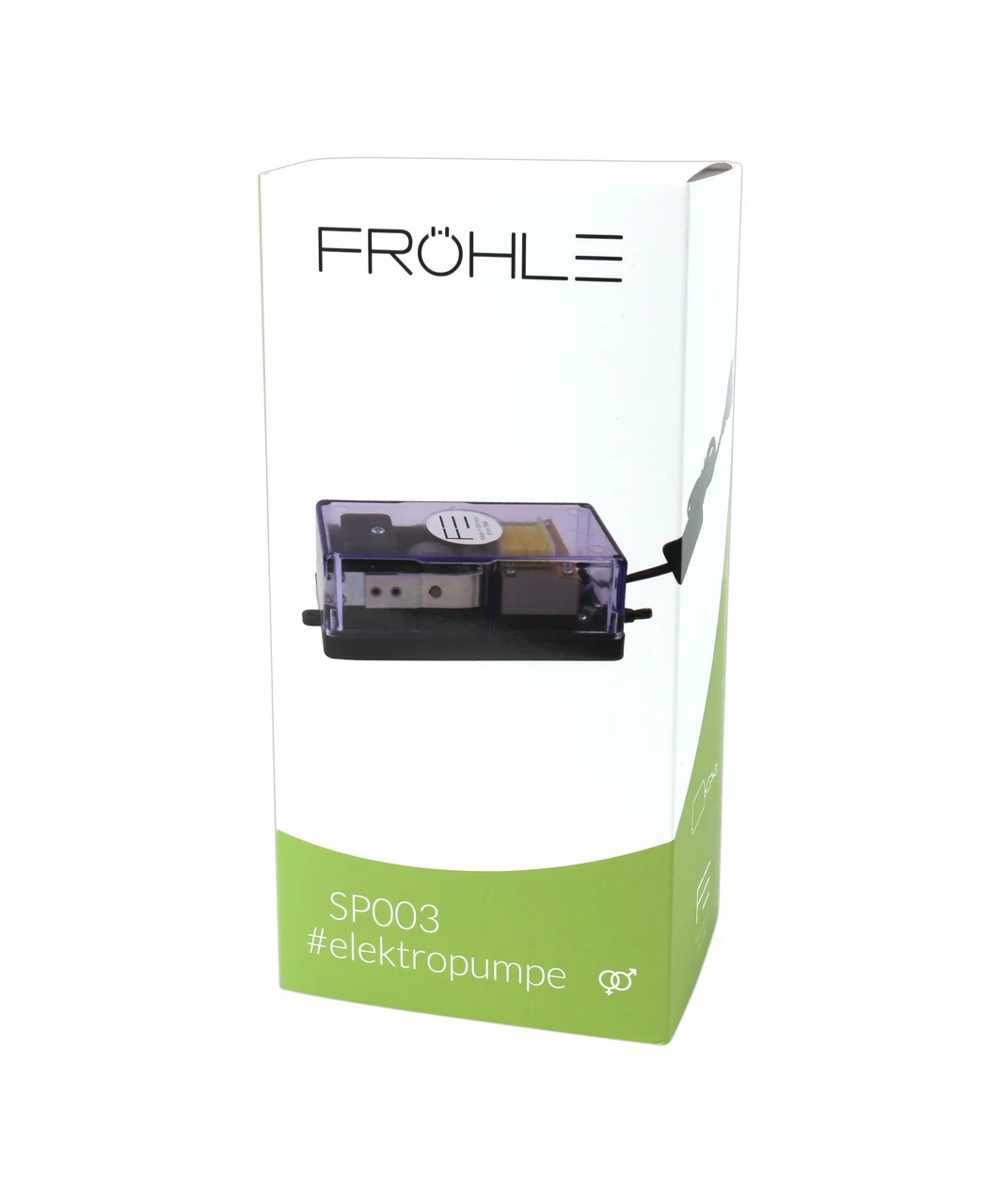 The electric pump (incl. pressure regulator and 1 m long connection tube) delivers a continuous suction power of approx. 330 Mbar almost without any noise. It is primarily used for hands-free suction massages with the wide range of FRÖHLE attachments – a suction cup or a cylinder, after applying intimate cream or personal moisturiser and attaching a suitable attachment sleeve to the underside of the suction cup or cylinder. The electric pump is used in the same way as a manual pump. Attach the hose connection to the electric pump and connect the power plug. Make sure that the pump is upright and not near water. The switch on the power cable allows you to turn the pump on and off. 220 V power supply.