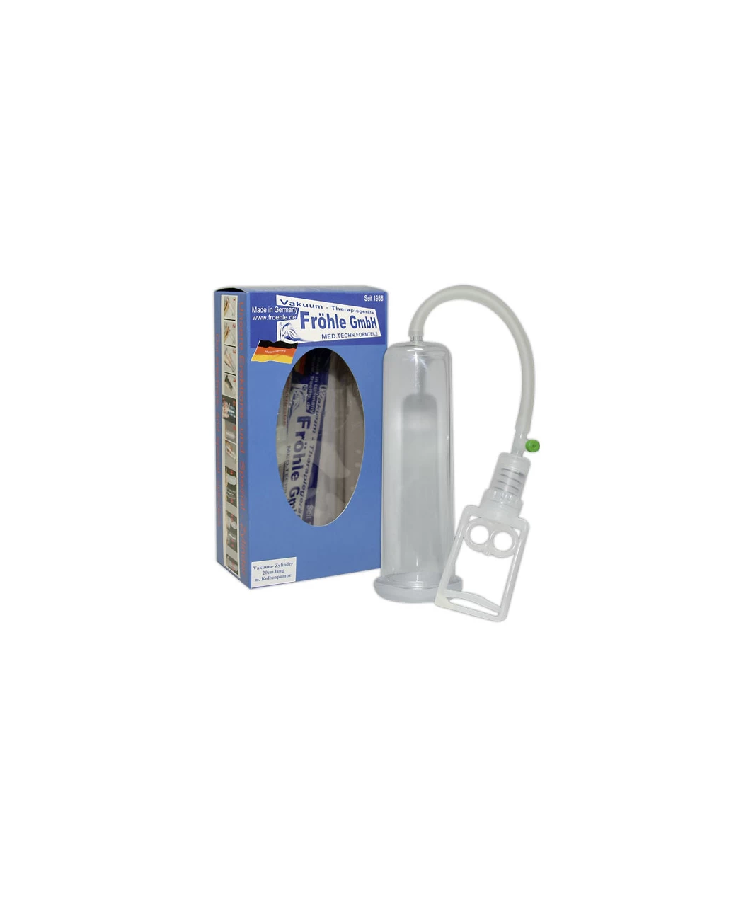 Medically and technically tested product by Fröhle; for local vacuum treatment of the penis. Patented. Complete set for a well-directed penis training – more stiffness and power immediately! Transparent vacuum cylinder (20 cm long, Ø5 cm) with cuff, piston pump and pressure control. Material: PVC/PP.