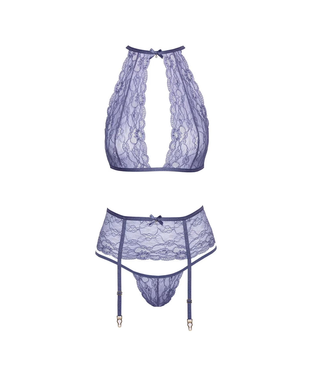 The soft halterneck bralette, garter belt and G-string in a set made entirely of soft purple lace. The bralette and garter belt has back hook closure; the straps and suspenders are adjustable.