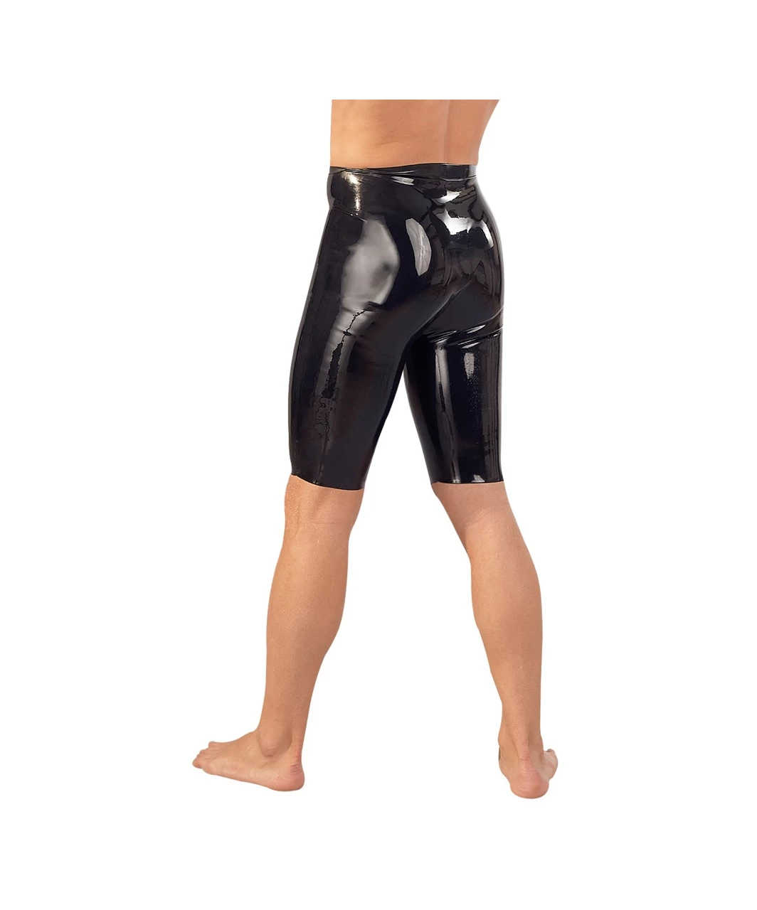 Black latex cycling shorts with an anatomically shaped penis/testicle sleeve. There are pronounced veins on the penis sleeve. Flat dipped. 100% latex.