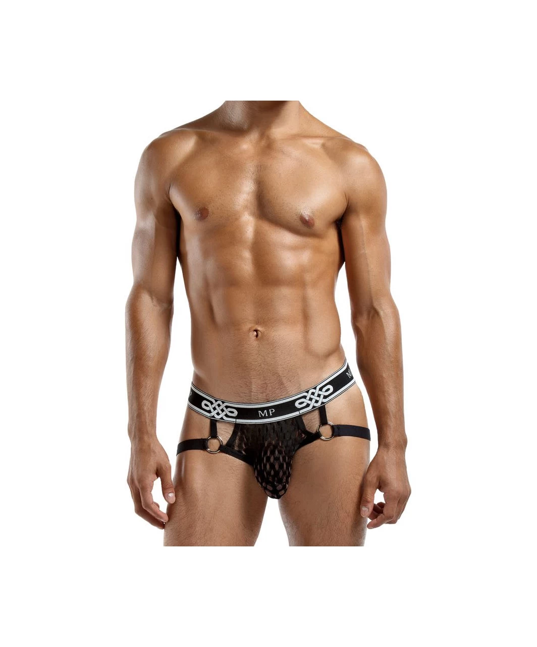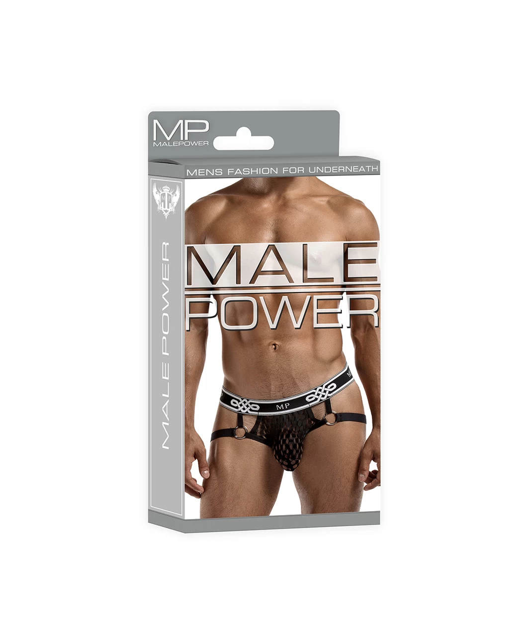 From the Peep Show collection by Male Power, this style features: black jock with plush elastic leg bands attached to decorative metal rings, new plush Male Power branded waistband. Feather light nylon spandex blend with soft stretch and open weave design offering a sneak peek of what’s beneath.