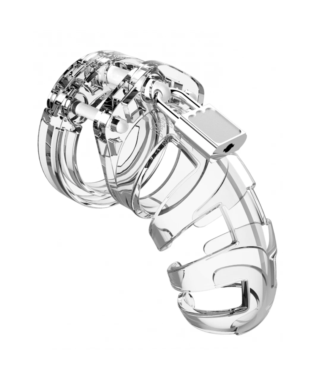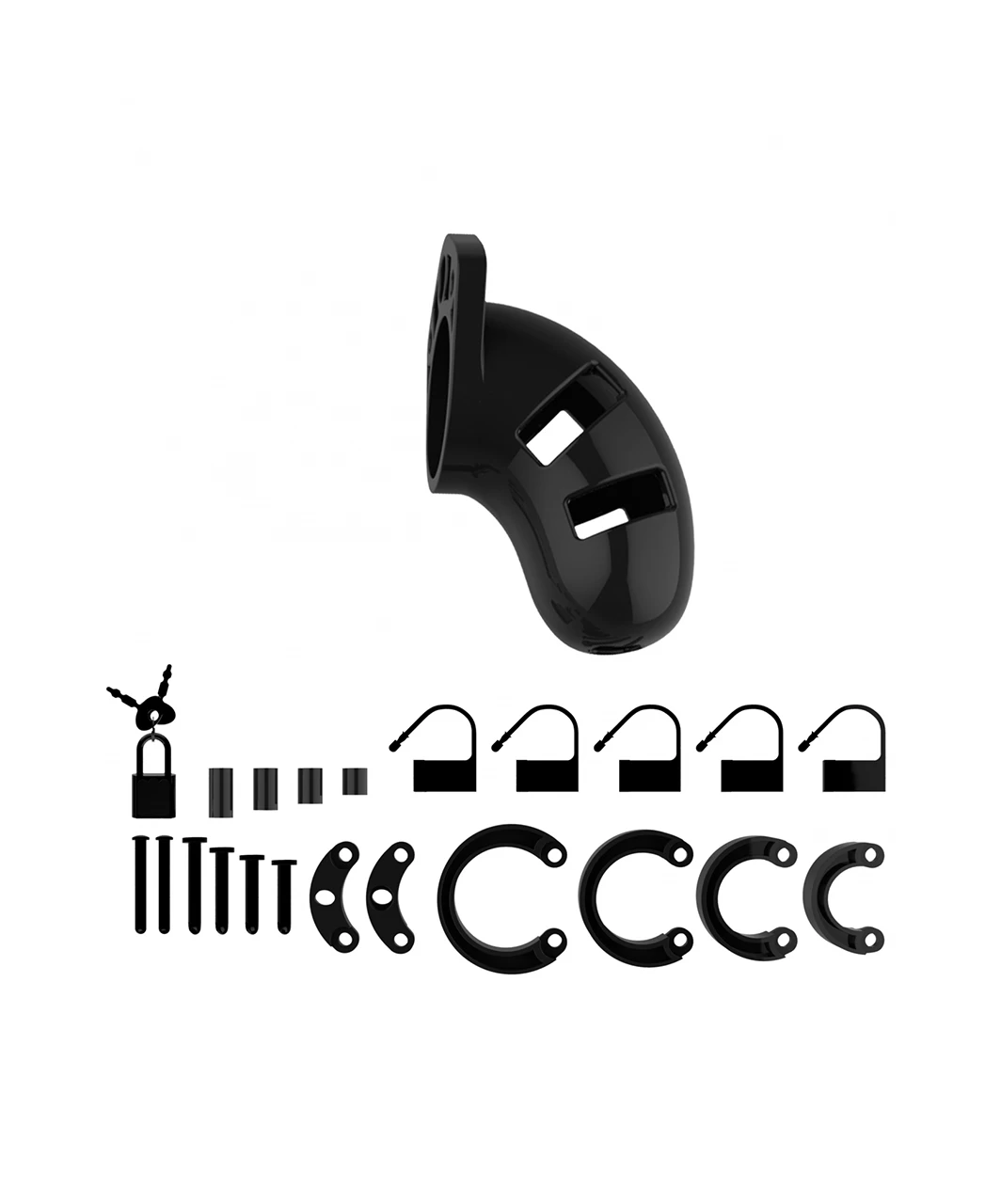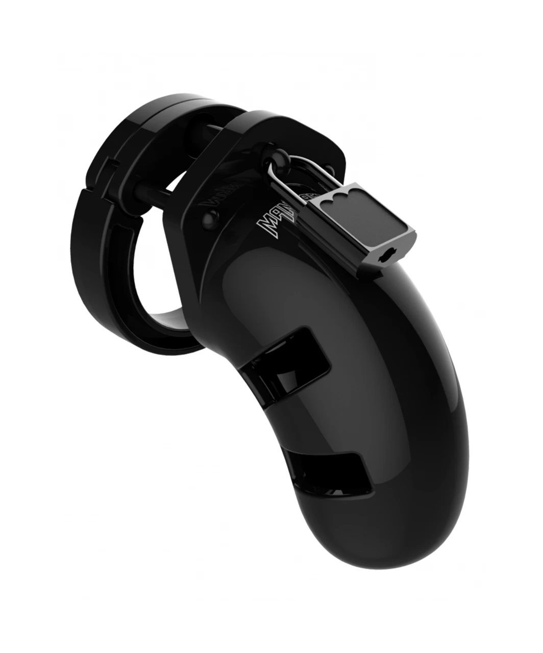 The ManCage Chastity Cages are manufactured from high-grade polycarbonate, a very light, durable and hypoallergenic material. The cage consists of three parts which fit perfectly together. The two guidance pins connect the top parts and the oval taper pin connects the rings with the cage. A variety of rings in different sizes and distance pieces will allow you to create the perfect size! The rings have a comfortable fit and are absolutely safe. A metal lock or tie-wrap lock can easily close the cage. The included tie-wrap locks ensure that they will not trigger the alarm of metal detectors at parties, festivals or even airports! As hygiene is very important while wearing a cage, the superior ManCage series are equipped with a variety of vents and a urination opening. The cage makes it impossible to get an erection but it will be, after liberation, super intense, just like the freeing orgasm to follow! The ManCage Chastity Cage gives the key-holder optimal power over sexual gratification!