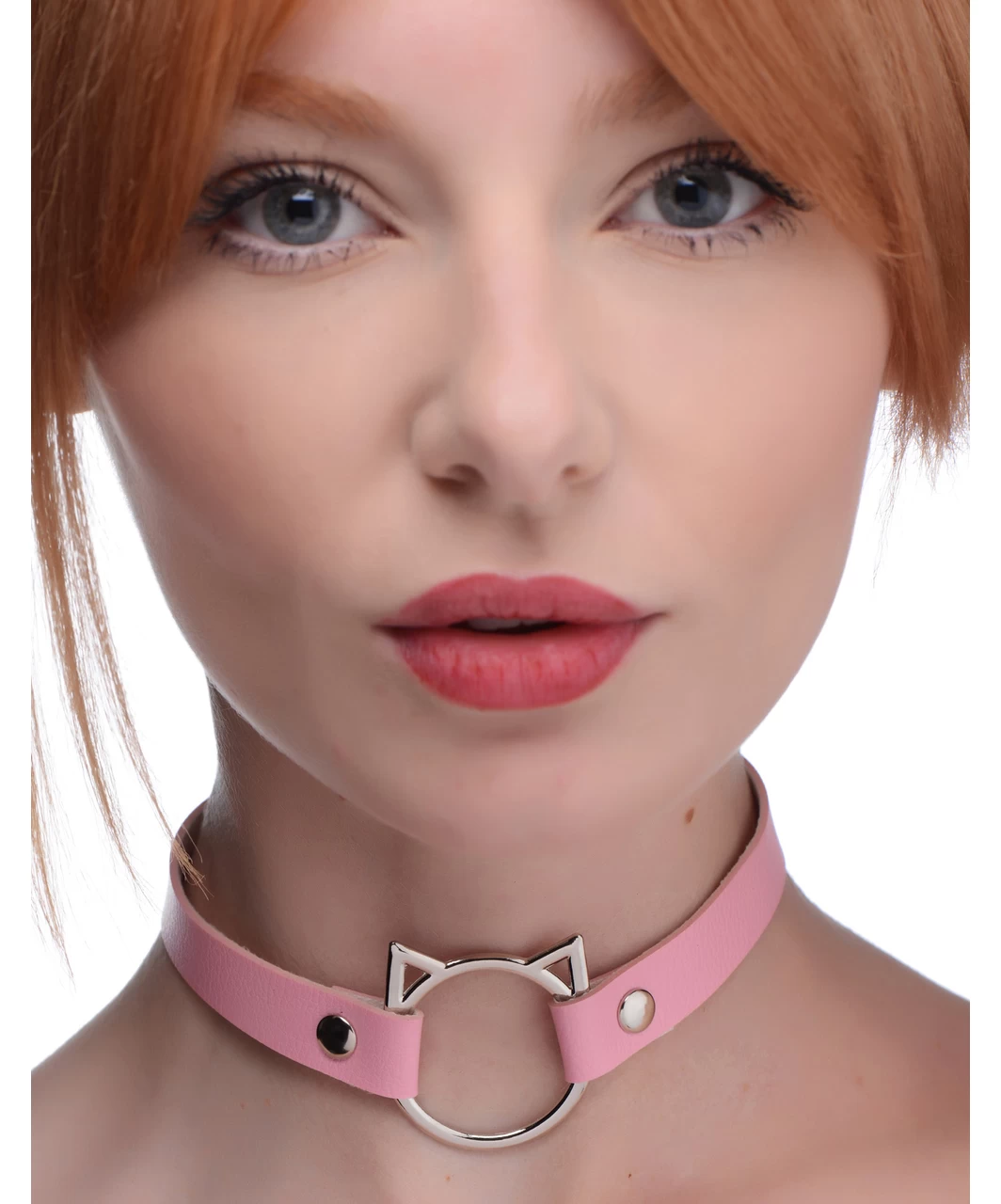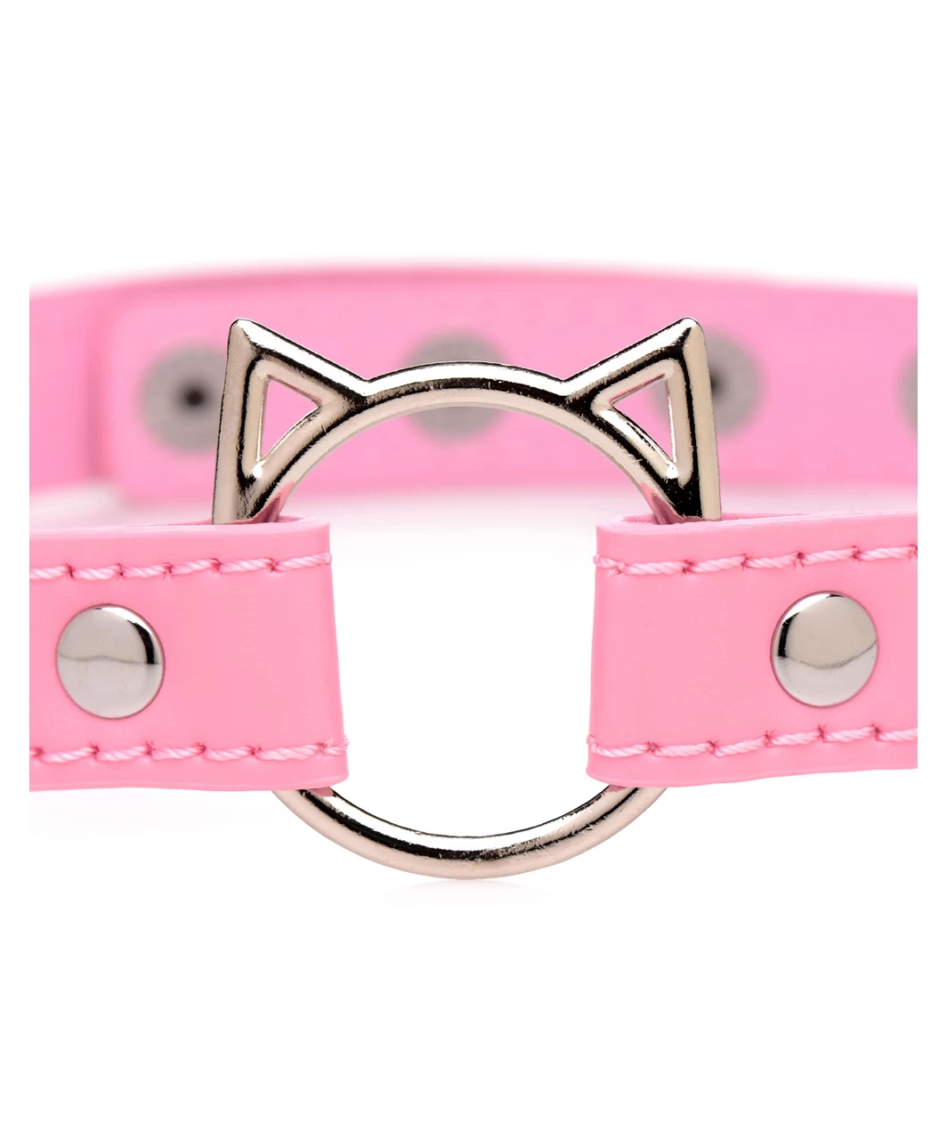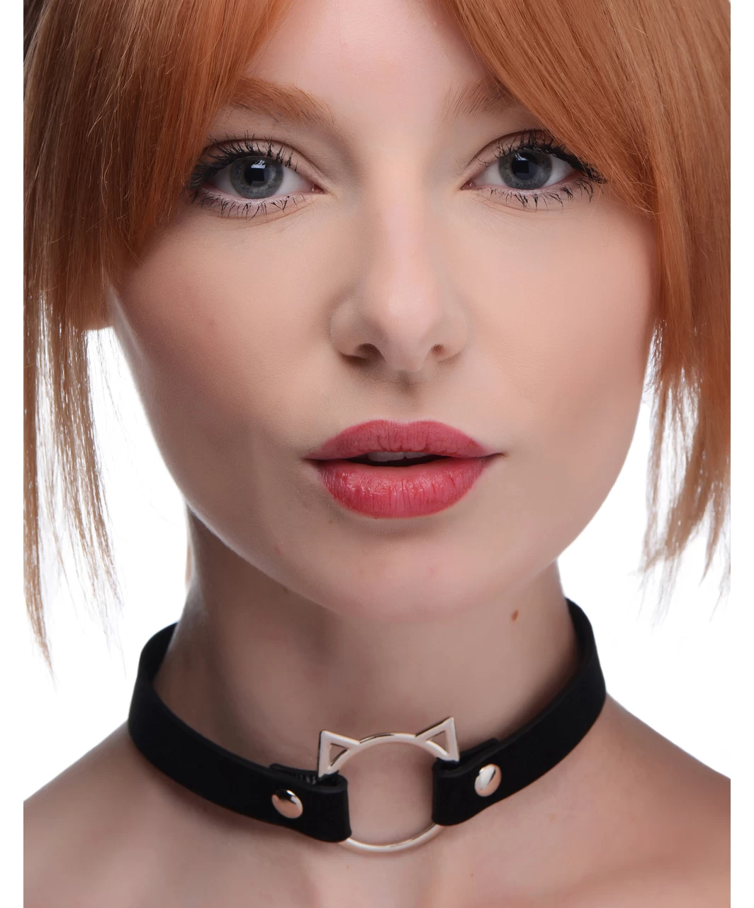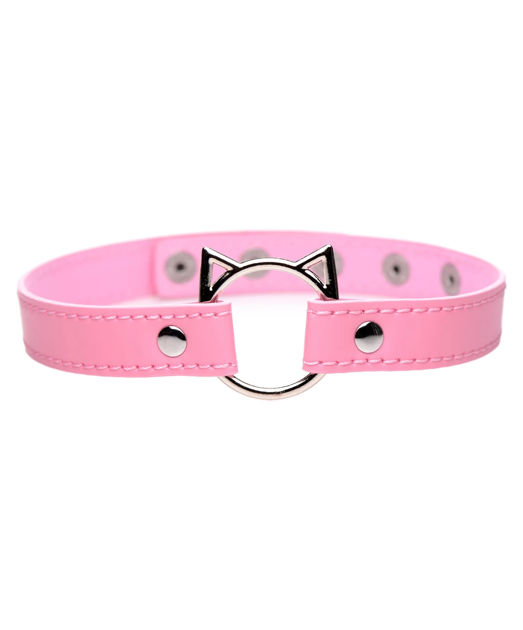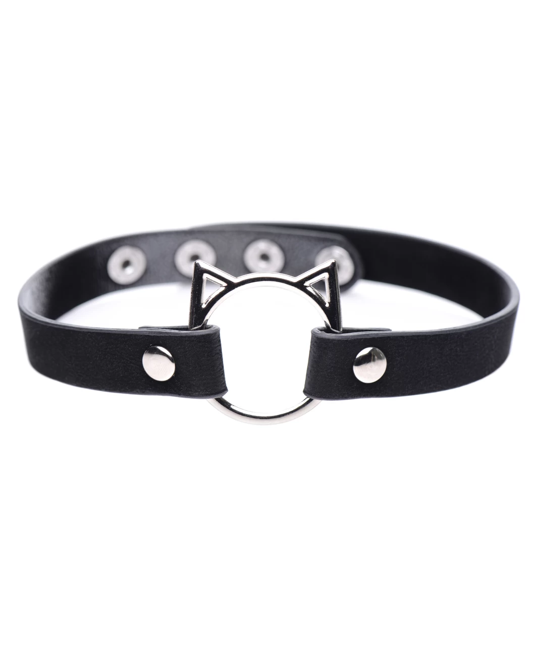 Leatherette choker with metal kitty ring. Adjustable press button closure.