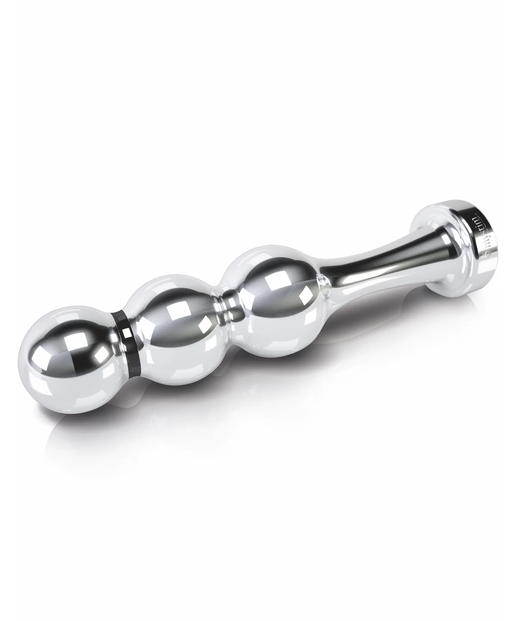 Bi-polar e-stim dildo made of hand polished medical aluminium with three bulgy and pronounced balls and all-surface conductivity. Stimulates vagina and rectum intensively even without current. Chill it under cold water or put it in the freezer for ≈ 2–3 min. for a cool sensation. Run the dildo under warm water to heat things up! Aluminium will retain the temperature, allowing you to play with its sensation against the skin.