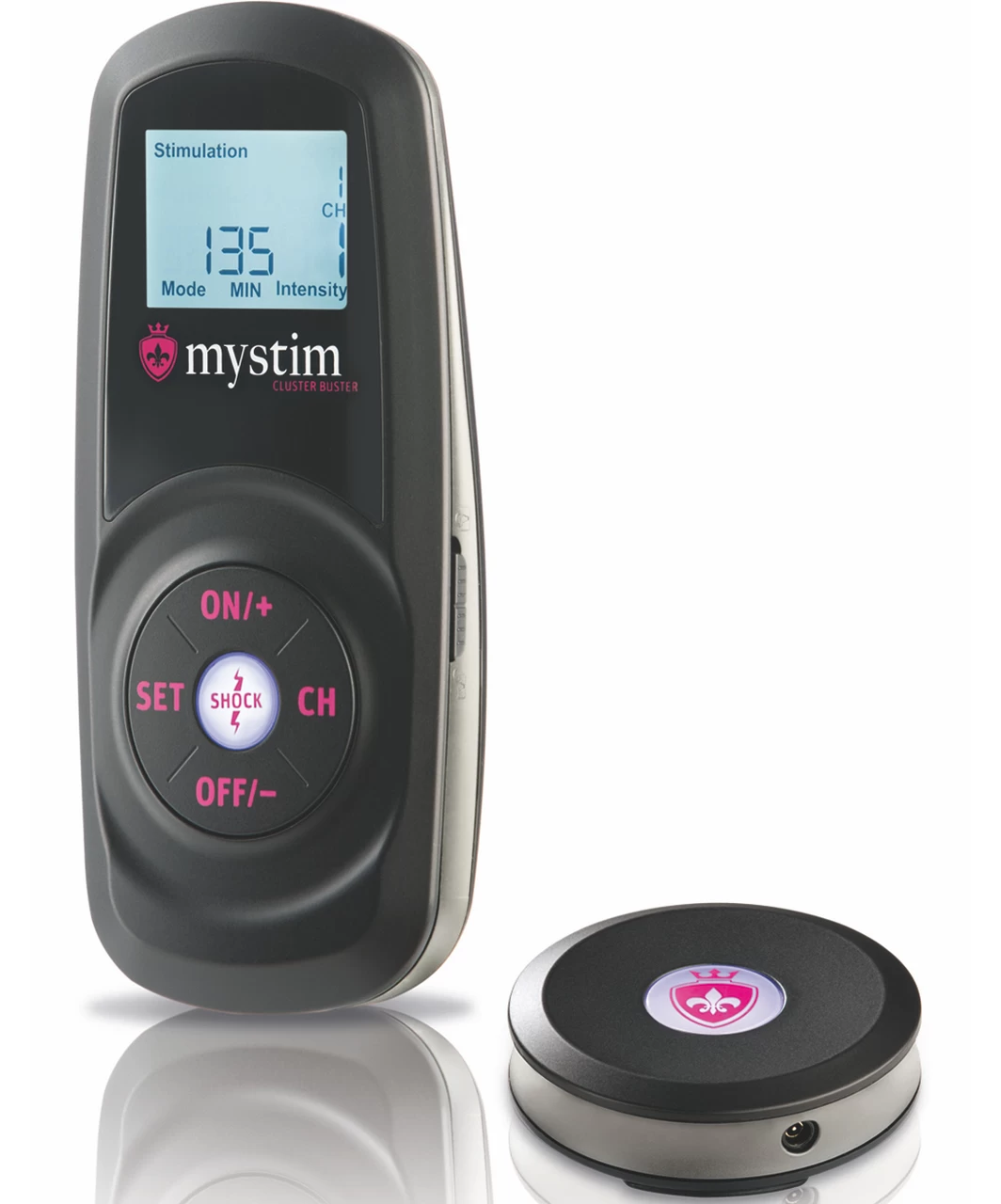 Mystim Cluster Buster is certainly splendid: It can pamper or torture you with 10 intensity levels, just the way you want. With 12 sensuous stimulation programs and 5 effective training programs (e.g. for the pelvic floor) definitely leave nothing to be desired. The Cluster Buster remote control has 8 channels which means that it can simultaneously control eight different programs, intensities and “treatment periods”, without cables. You can select as many receivers as you want within these eight channels. The Cluster Buster comes in a set containing the remote control and the receiver for the Channel 1. This receiver is compatible with Mystim accessories*, so that they can all be remote controlled from now on.