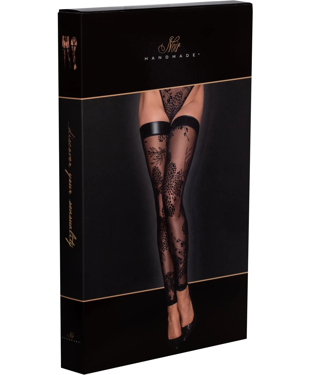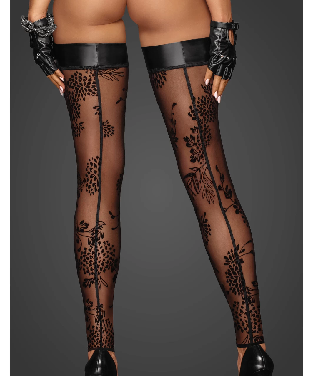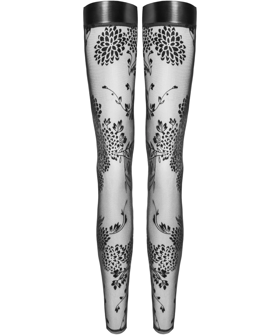 Black sheer footless, hold-up stockings with delicate flock print and welt made of matte look fabric.