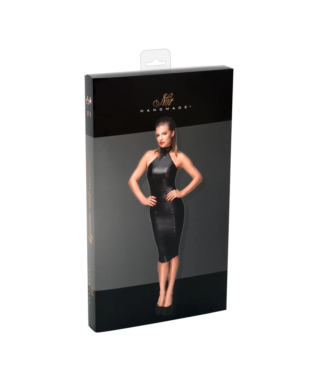 Black matte look tight-fitting sleeveless dress. This knee-length halterneck dress is fitted at the waist and has a cheeky elastic choker with a flat metal ring hanging down on the front, a 2-way zipper on the right side in the front and a regular zipper in the back.