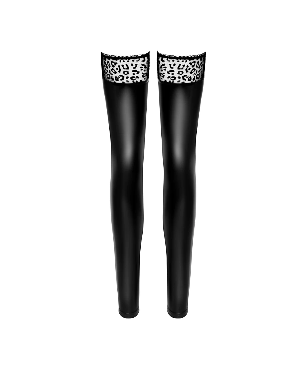 Black matte look footless, hold-up stockings with sheer welt adorned with flock in leopard print. Optionally, can be worn with suspenders.