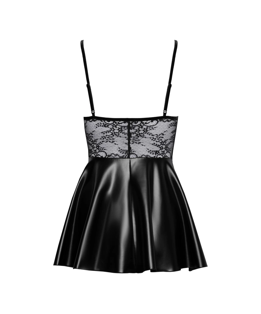 Black mini dress with a tight-fitting sheer lace bodice with underwire cups and front zipper. The flared skirt made of matte look fabric. Shoulder straps are adjustable.