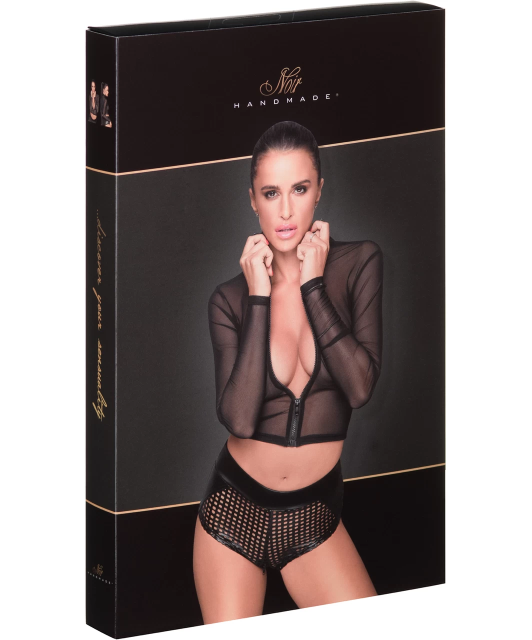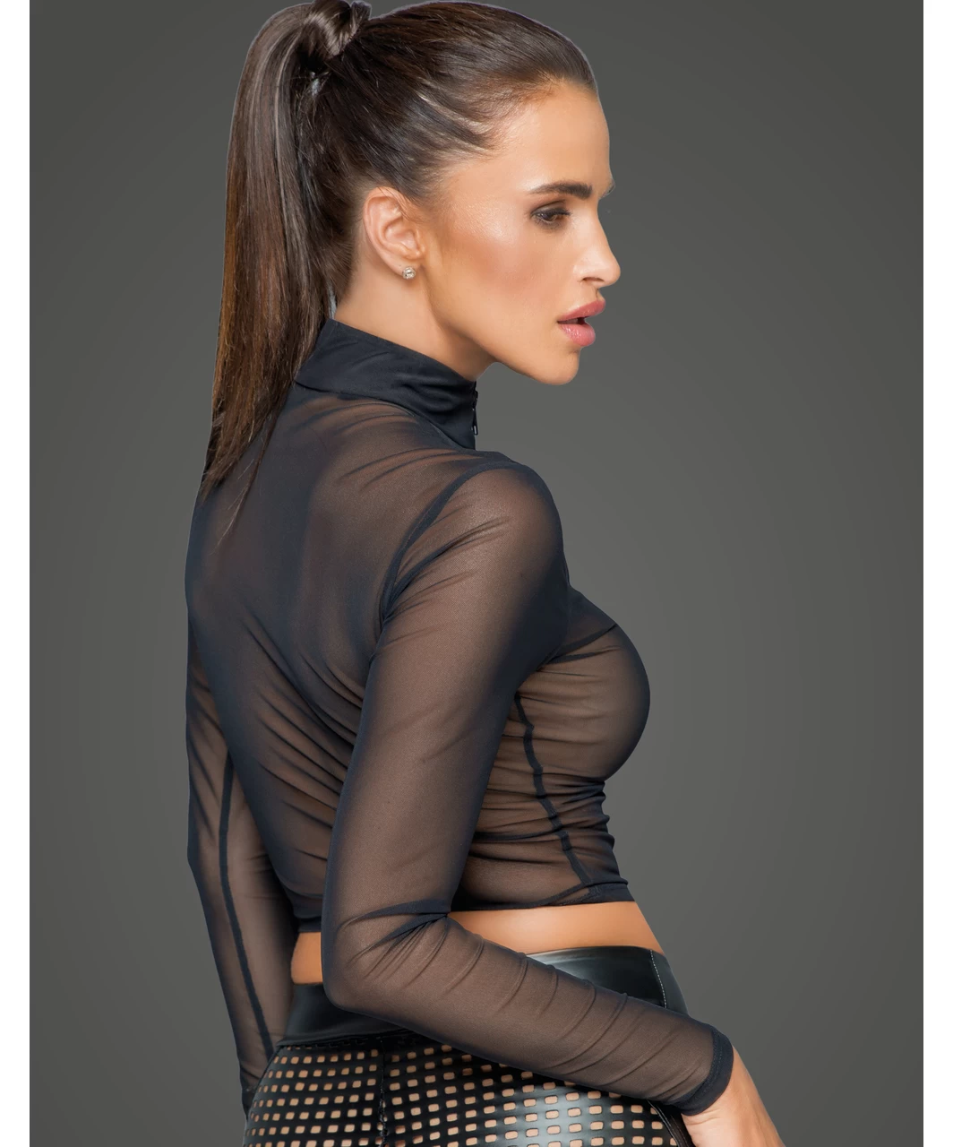 Black sheer mesh crop top with front zipper and long sleeves.