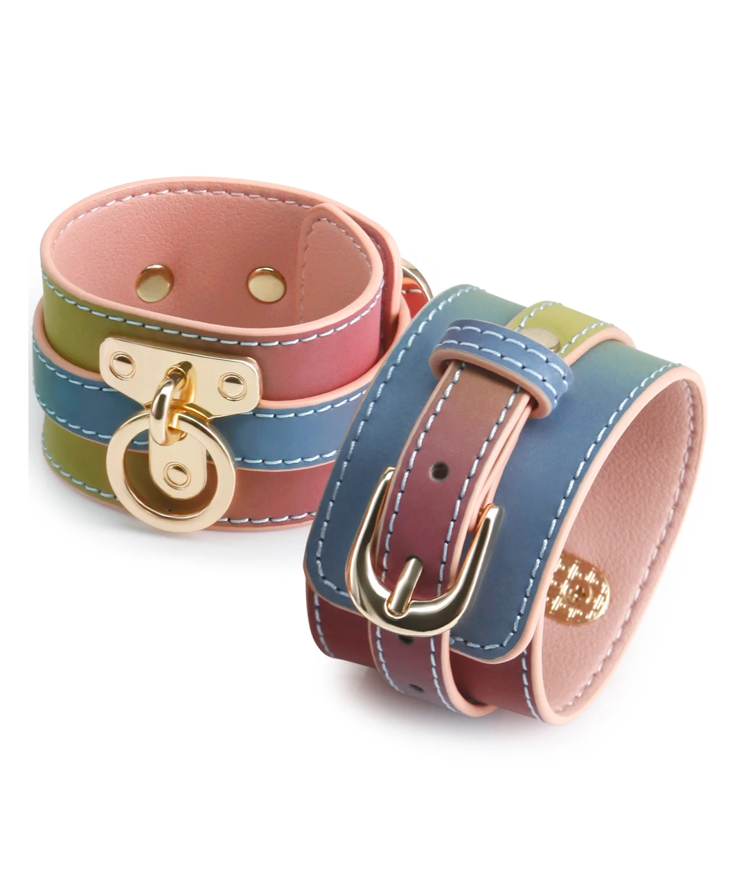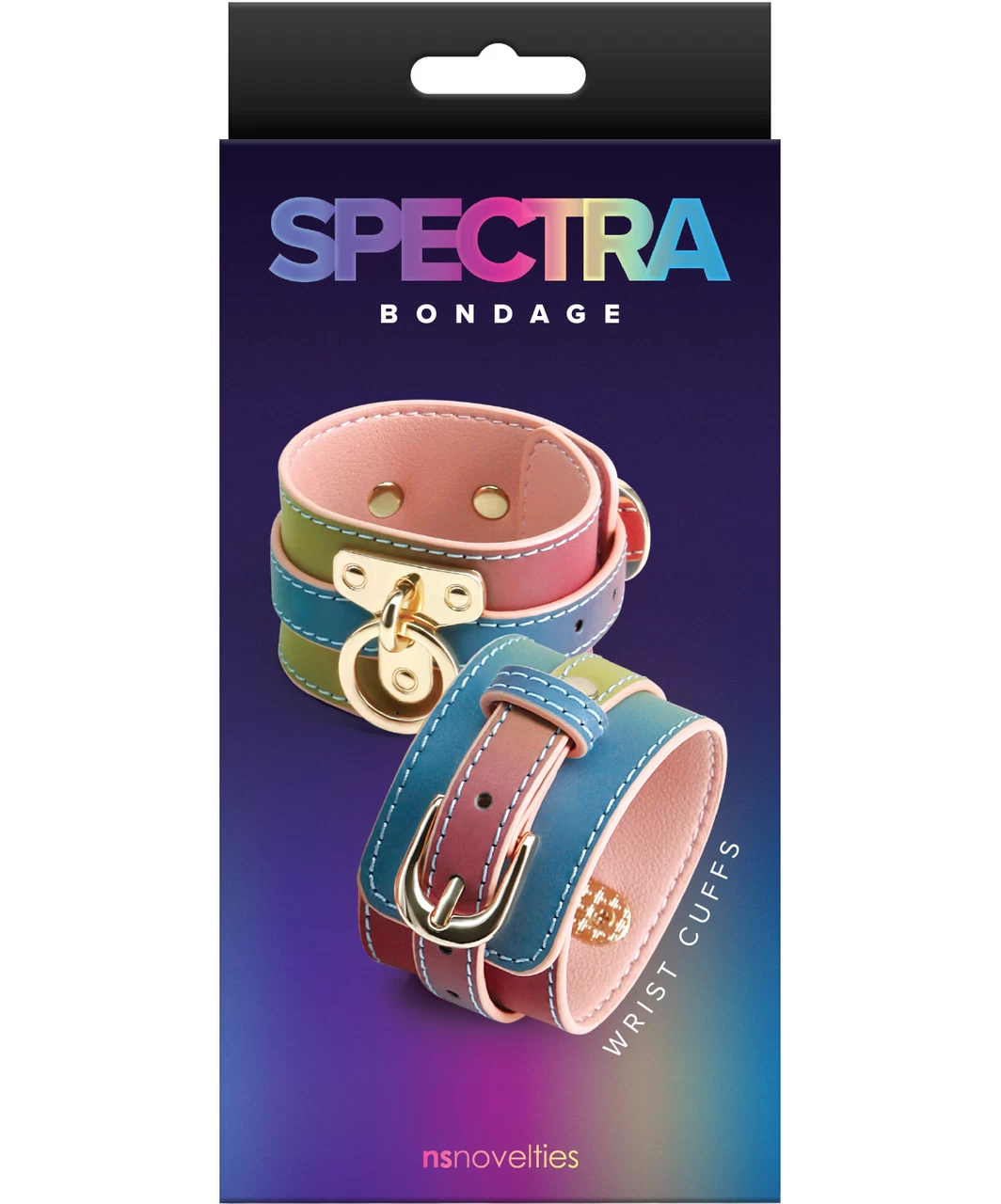 Krāsainas, mazliet spīdīgas, mākslīgas ādas roku saites ar zeltainām metāla sprādzēm un savienojumu ar karabīnēm. Roku saites ir daļa no Spectra Bondage izlases, kas ietver dažādus piederumus gaumīgām BDSM rotaļām un fotosesijām.