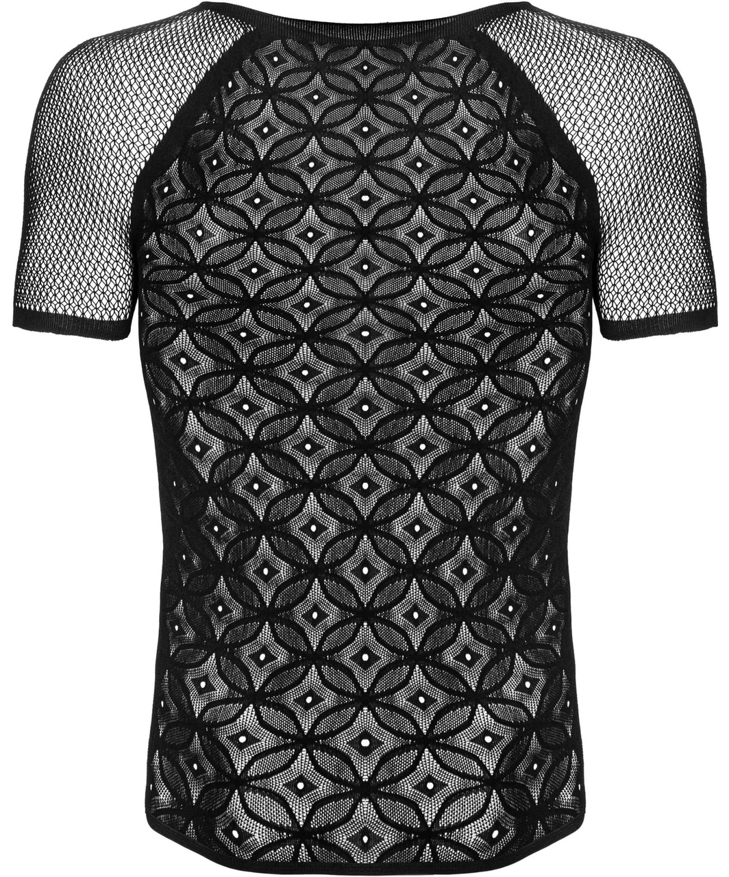 Black, elastic knit T-shirt with a geometric pattern. Unisize (S–L).