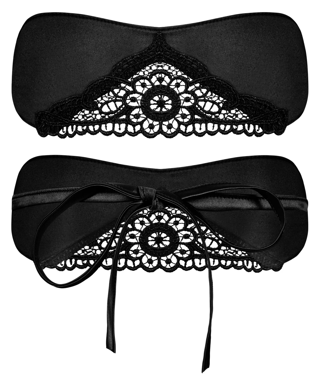 Black satin blindfold with beautiful guipure decoration on the front, to be tied with black satin ribbon.