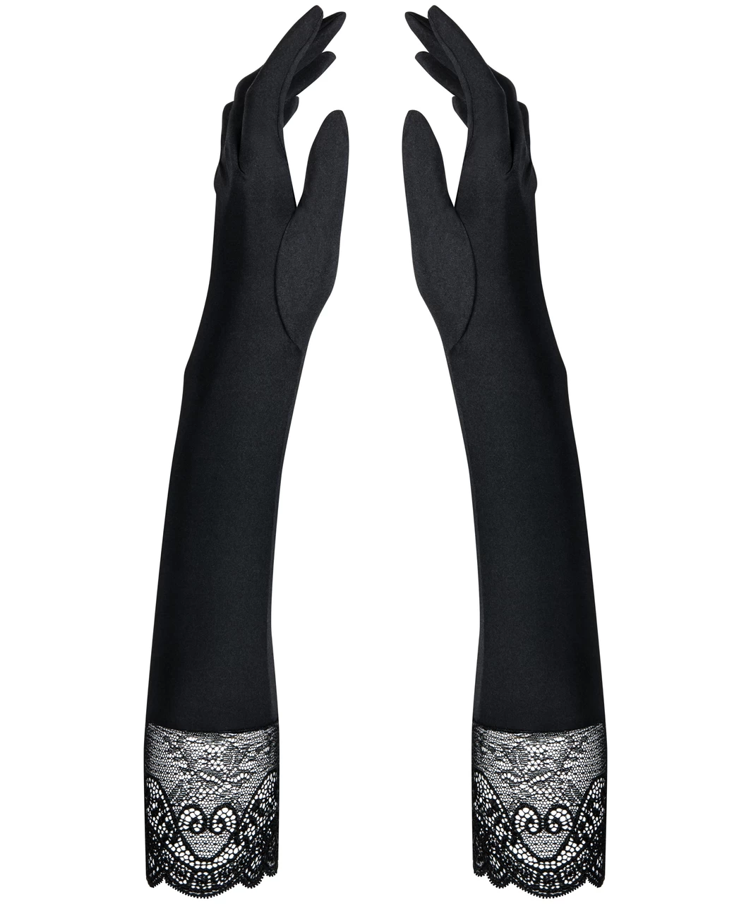 Elegant elbow length evening gloves made of soft black satin and delicate lace adorned with black rhinestones. Unisize.