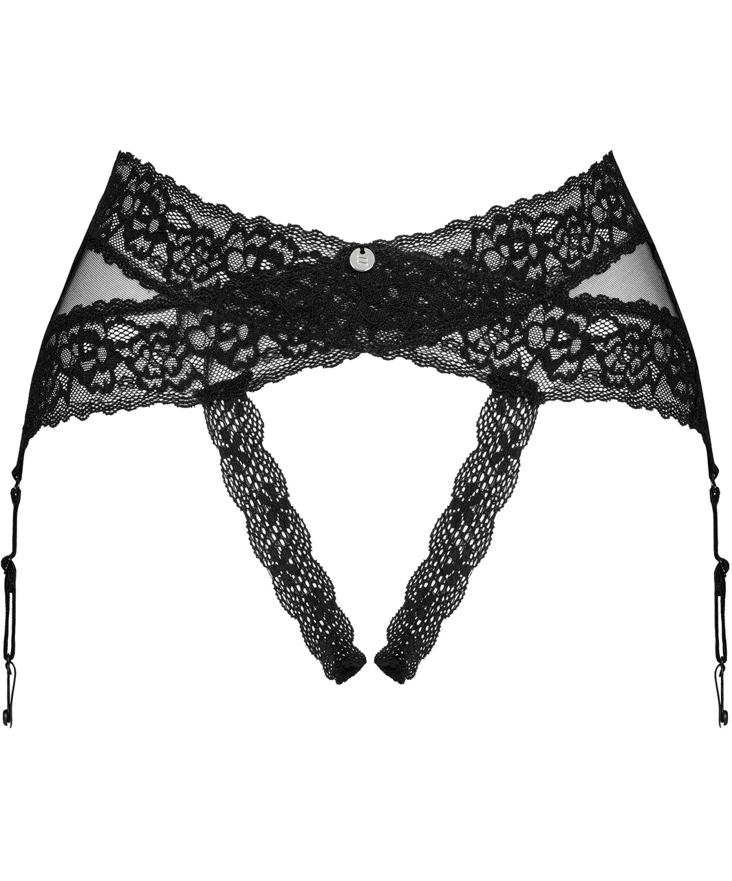 Black lace crotchless thong in garter belt style with adjustable side suspenders.
