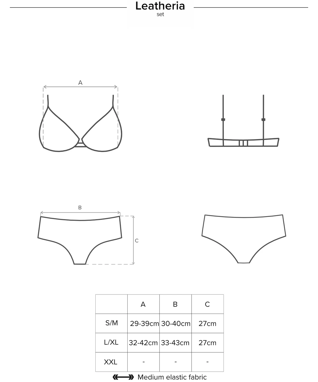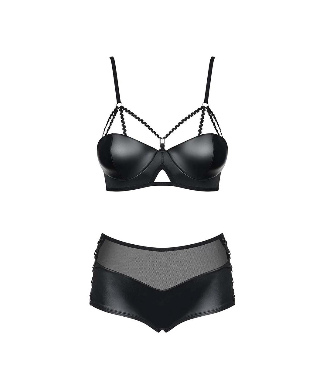 Black lingerie set made out of stretchy matte look fabric and sheer mesh. Decorative straps above underwire, padded cups. High-rise briefs with sexy lacing on the right and left side. Straps and closure are adjustable.