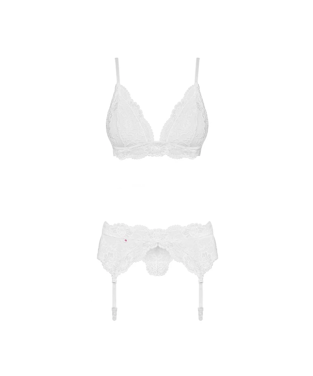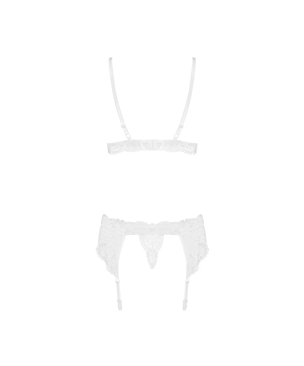 White 3-piece set consists of a bra with padded cups made of floral pattern lace with adjustable straps and closure, matching garter belt with adjustable garters, and also a thong. Stockings not included.