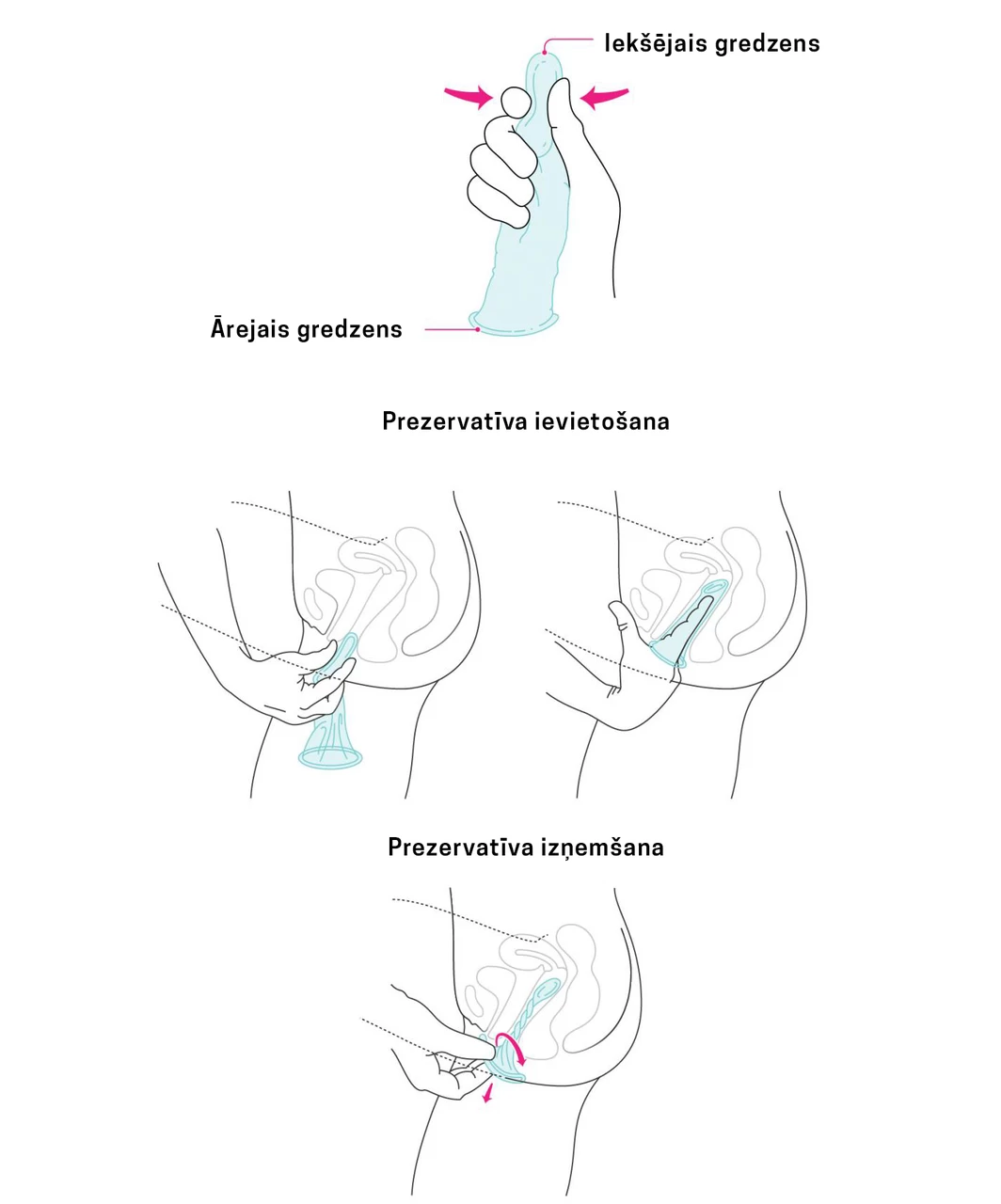 Choose a comfortable position (as you would insert a tampon or a cup), take the inner (smallest) ring in the closed part of the condom and squeeze into the shape of an “8” and insert it into the vagina. To prevent the condom from twisting extend it from the inside with your fingers and insert it deeper into the vagina by sliding the inner ring. If you feel that the ring does not fit on the walls, pull the condom outwards until you can place the ring correctly. The edges of the ring should touch the walls of the vagina. Before the penis is inserted into the vagina the outer ring of the condom should be held to prevent the penis from being inserted outside the condom. In addition, do not use a male condom with a female condom – this will not provide better protection and may damage the female condom. Use a sufficient amount of lubricant. When removing the condom, carefully twist the outer ring so the condom does not leak and remove it from the vagina.