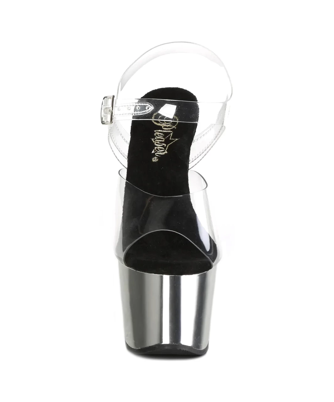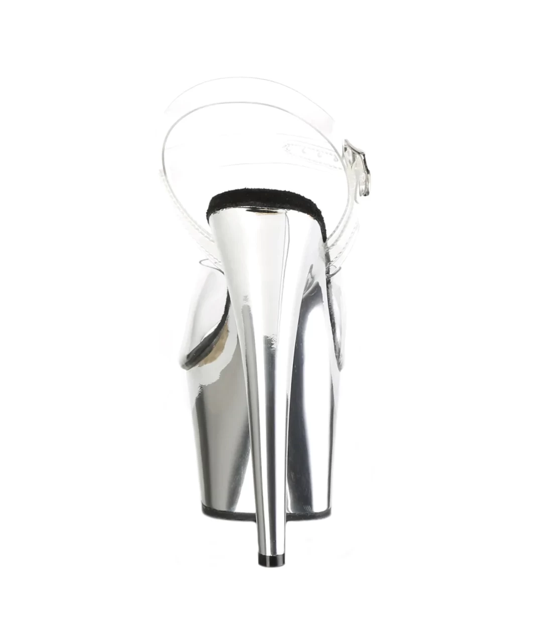 Transparent vinyl open toe ankle strap sandals with high silver chrome plated platform, stiletto heel and black microfiber insole.