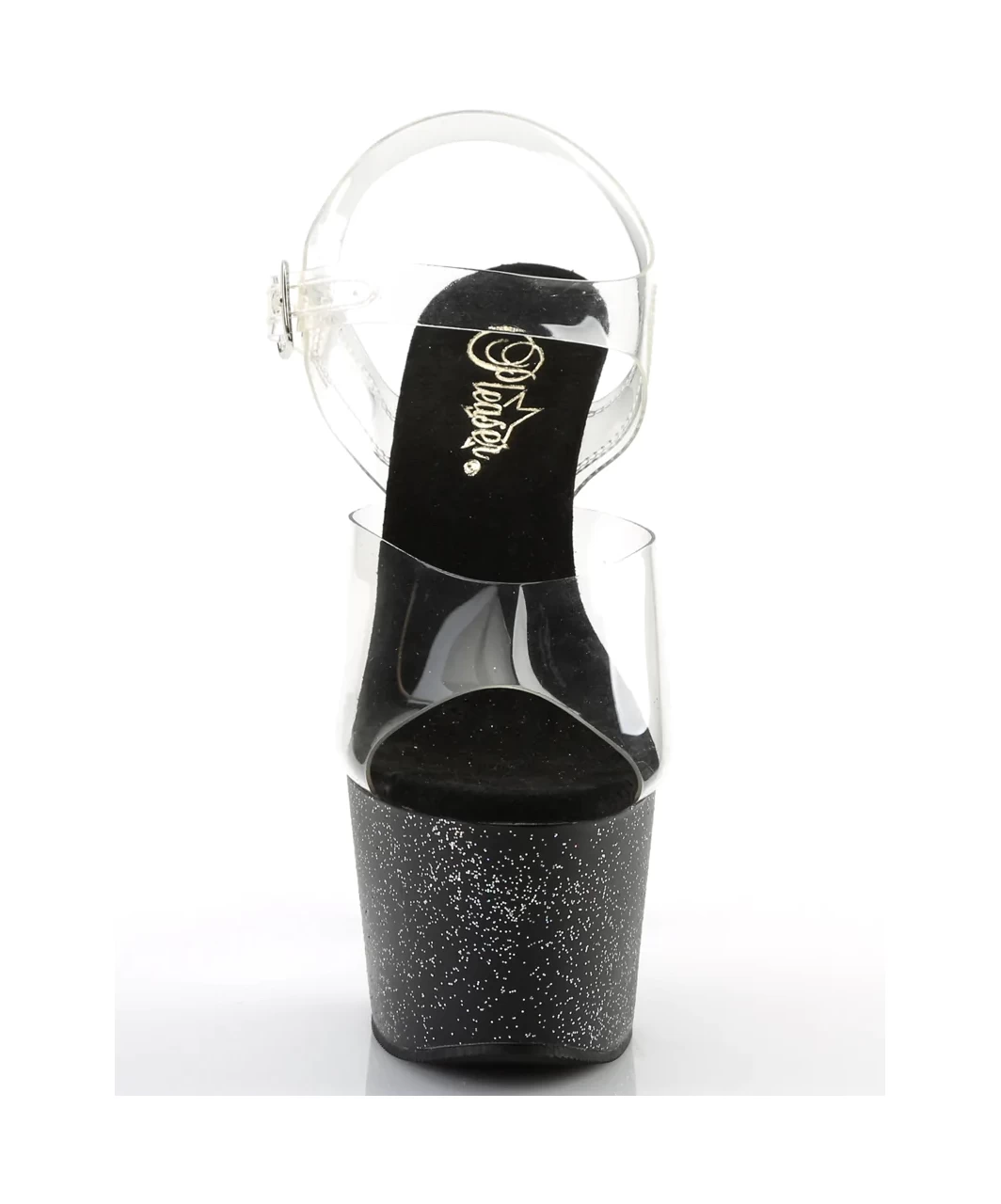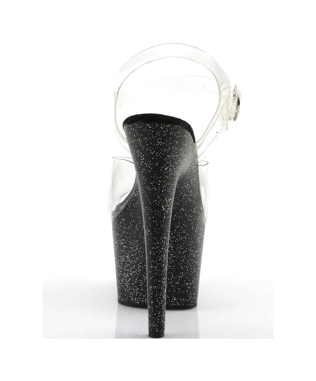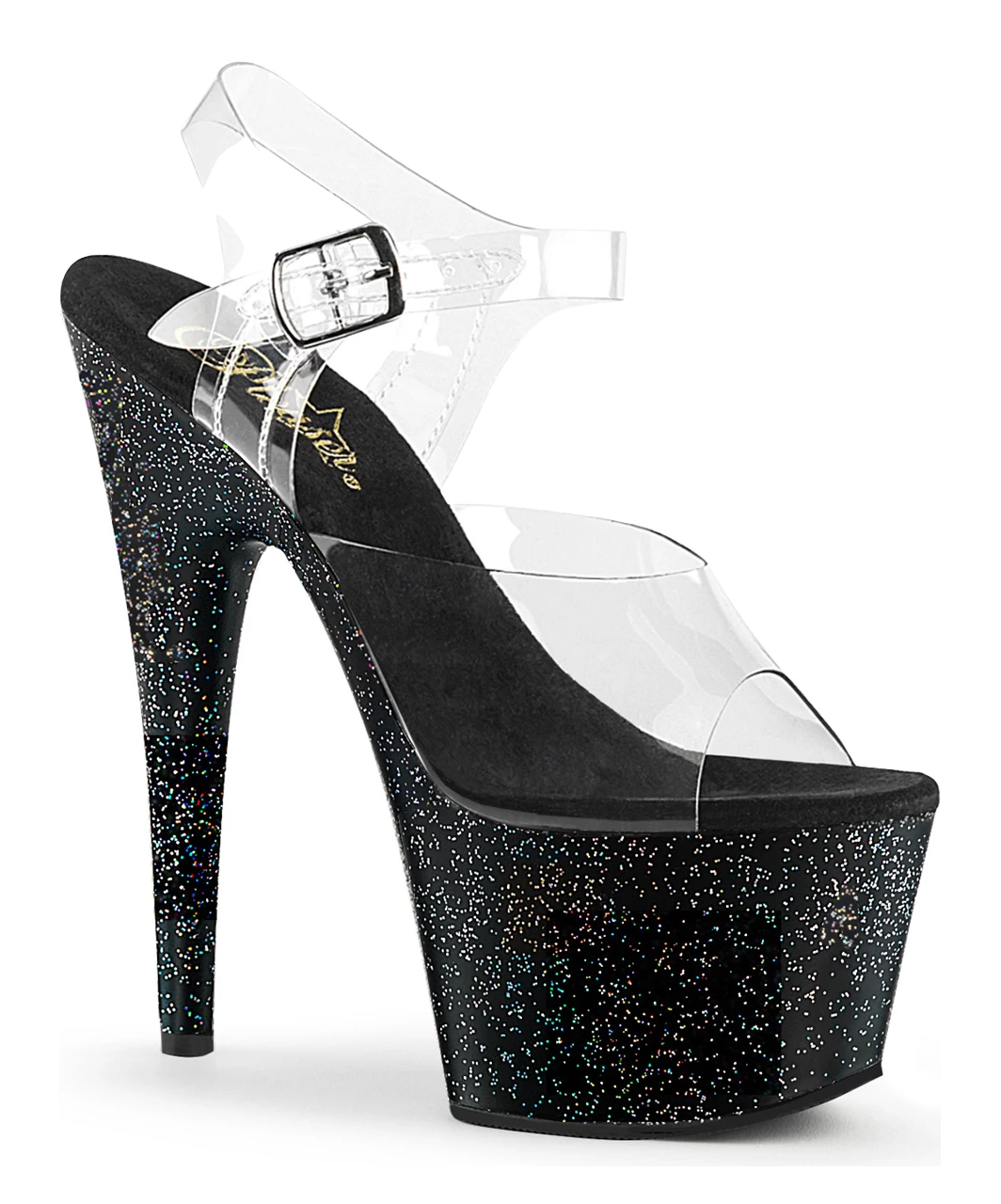 Transparent vinyl open toe ankle strap sandals with high black platform featuring iridescent mini glitter, stiletto heel and microfiber insole.